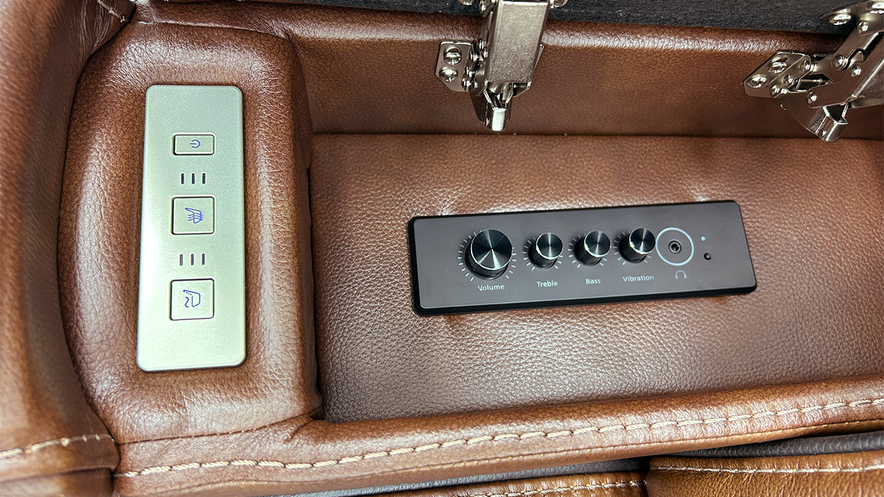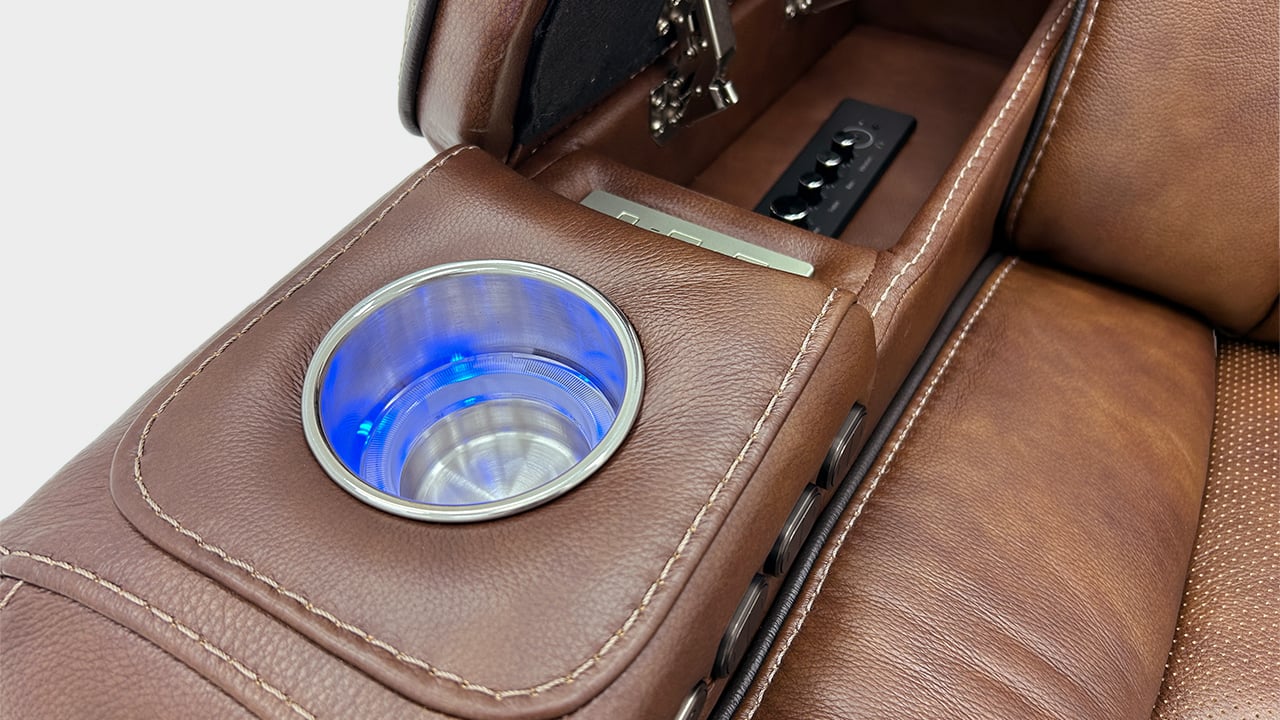 Integrated audio system with speakers built into the headrest of each reclining piece