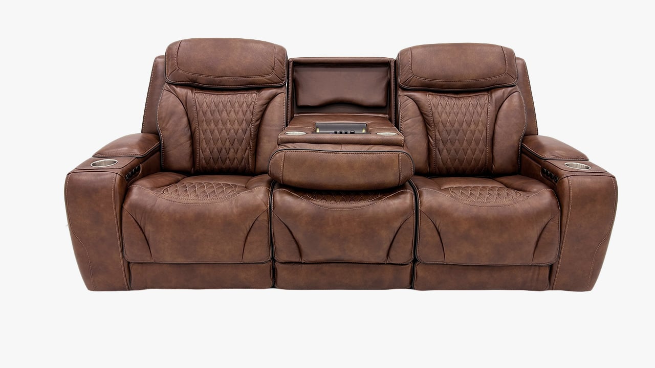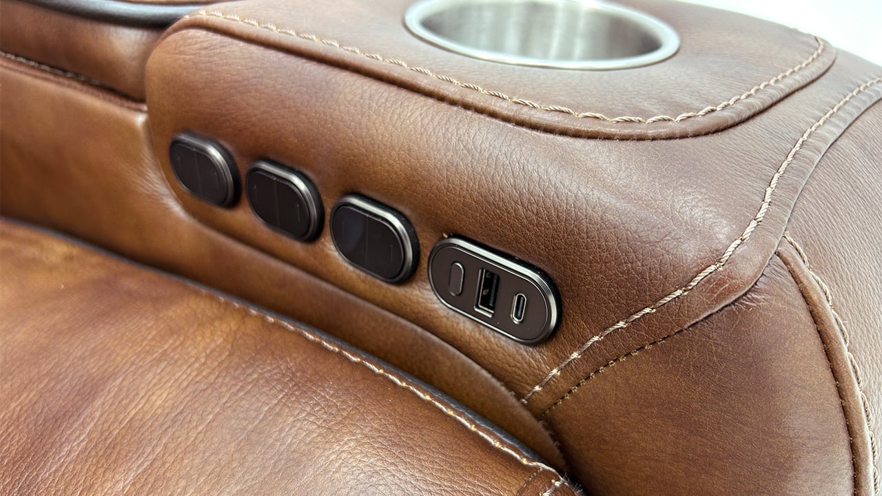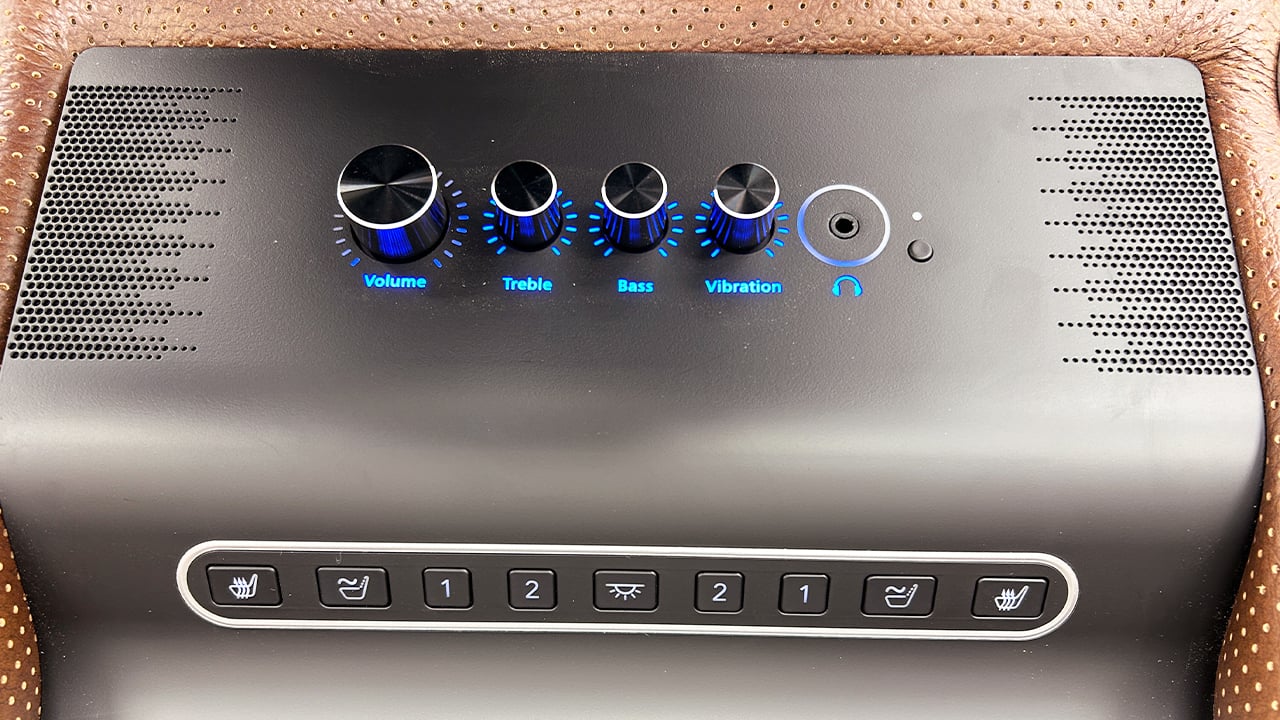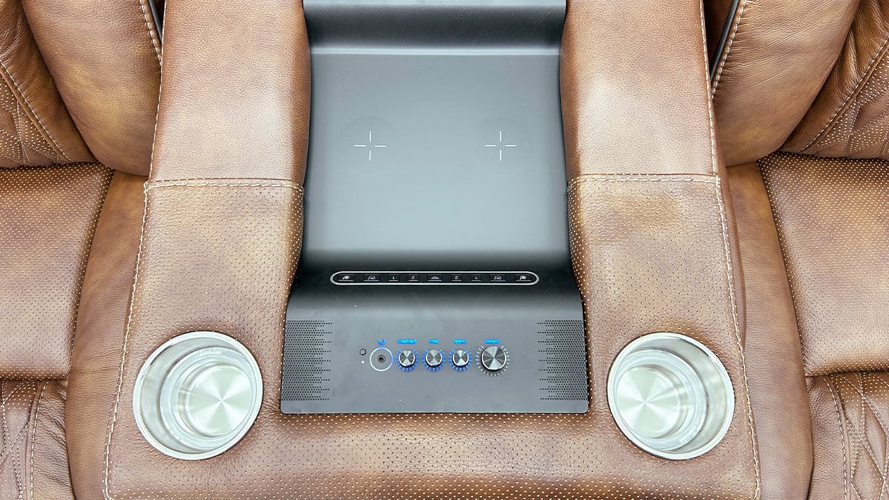 Flip-down center back with cupholders, wireless charging, and built-in speaker