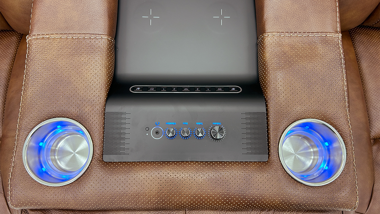 Integrated audio system with speakers built into the headrest of each reclining piece