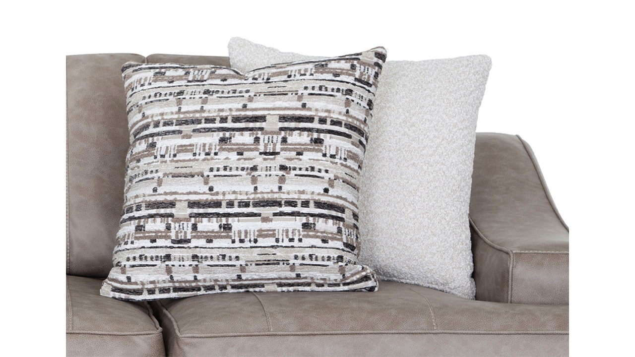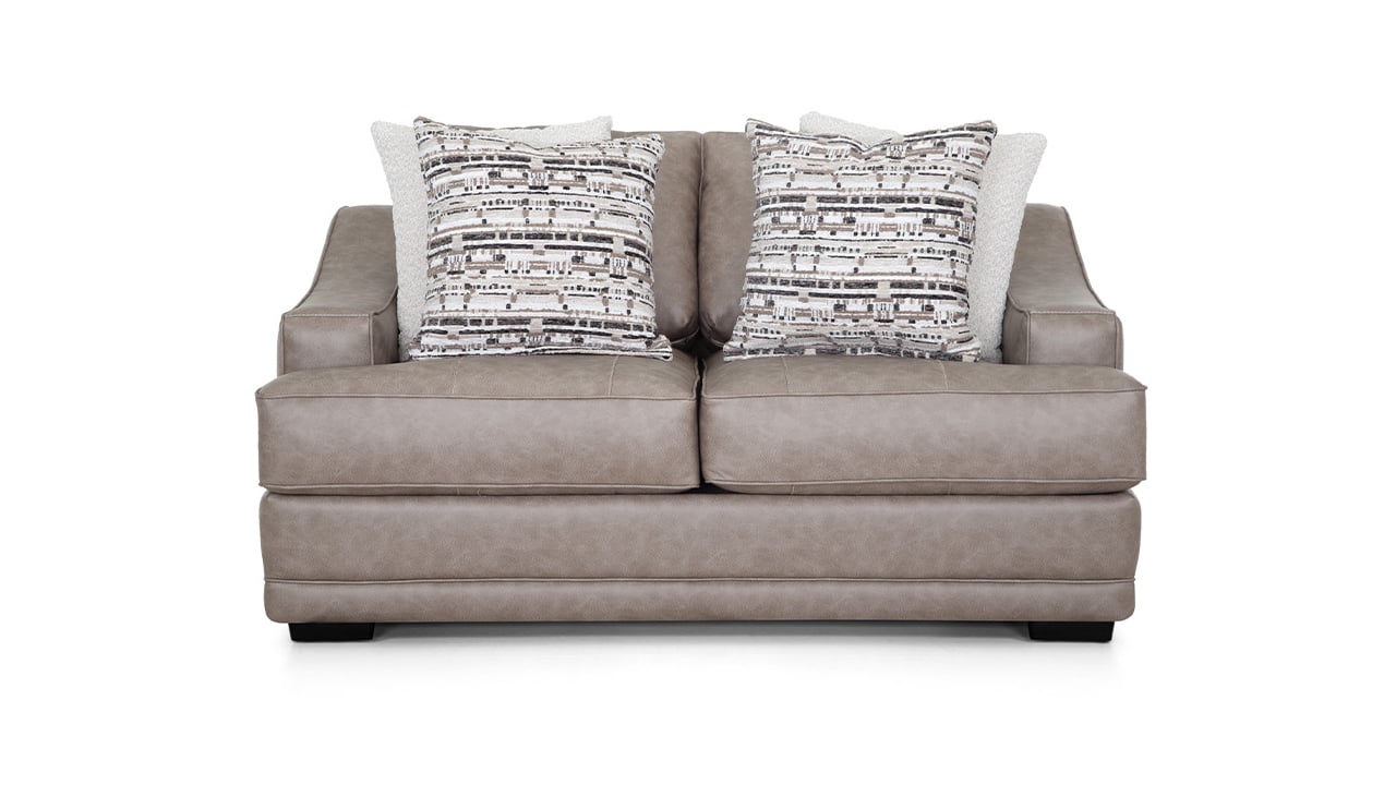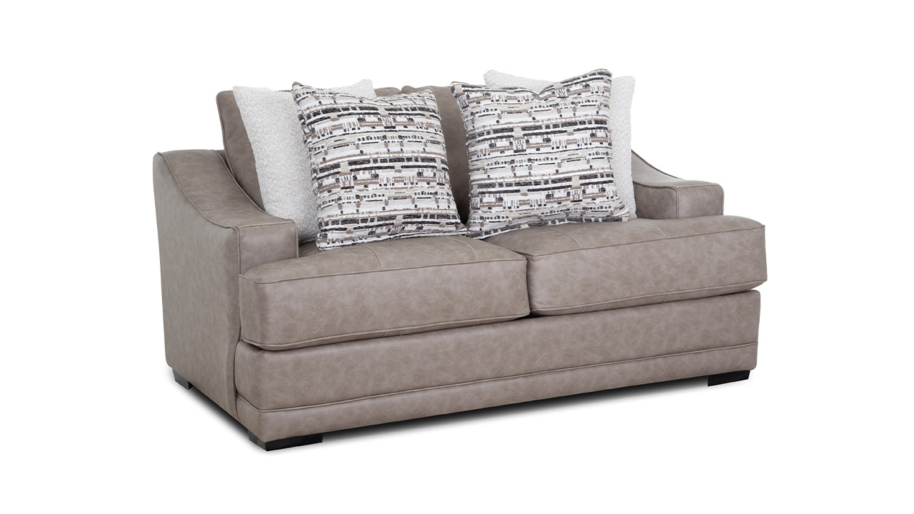 The Duvall Loveseat in natural offers a perfect balance of comfort and style, featuring deep, overstuffed cushions, padded inset slope arms, and coordinating throw pillows for a sophisticated, inviting feel.