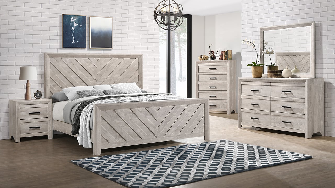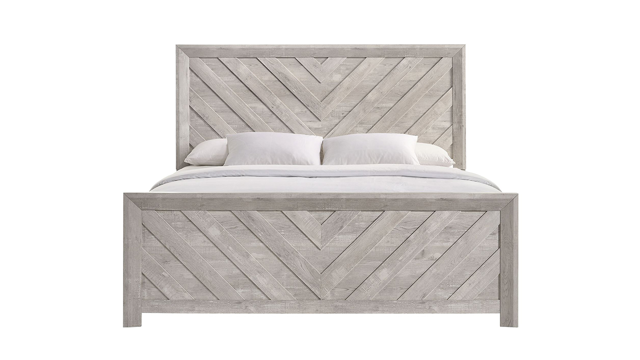 The Eleanor Queen Bed in white adds a modern edge with its clean finish and striking diagonal paneling. Spacious and versatile, it’s a chic centerpiece for master suites or stylish guest rooms.