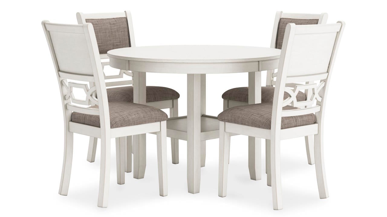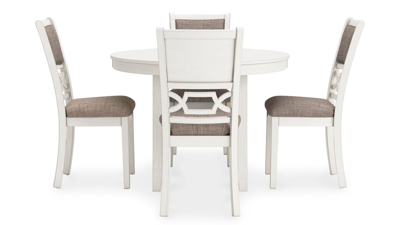 The Ashlee 5-Piece dining set in white brings a blend of chic style and relaxed elegance to any dining space. This set includes a dining table and four chairs, designed to create a captivating ambiance with its clean, timeless look. The crisp white finish pairs beautifully with light gray, textured upholstery, adding a touch of sophistication that enhances any decor.