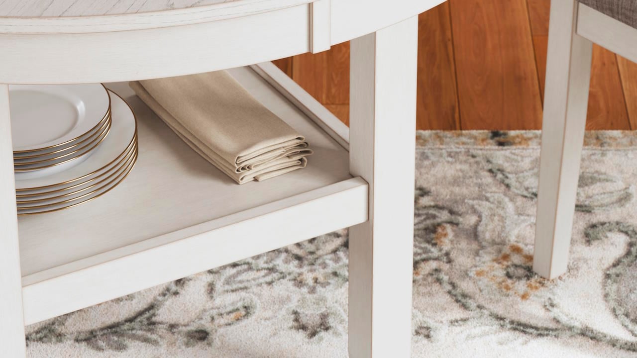 Embrace transitional elegance with the Ashlee 5-Piece Dining Set, featuring a sleek light gray finish, textured upholstery, and discreet storage, seamlessly blending modernity with timeless sophistication for intimate gatherings.