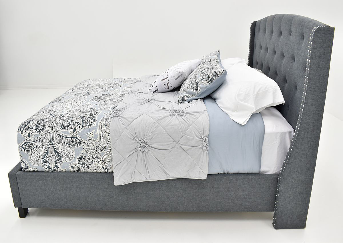 This Popular Queen Size Upholstered Bed by Crown Mark features a slightly-curved headboard accented with elegant details such as diamond button tufting, demi-wings, and nailhead accents over a beautiful and durable gray microfiber upholstery. Perfect for a primary or guest bedroom, this stylish queen bed will work in either a traditional or contemporary setting.
