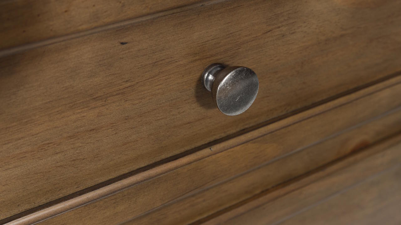 The Feddinger Chest blends timeless traditional style with everyday comfort, featuring a chestnut brown finish, aged pewter-tone knobs, and five smooth-gliding drawers for practical, refined storage.