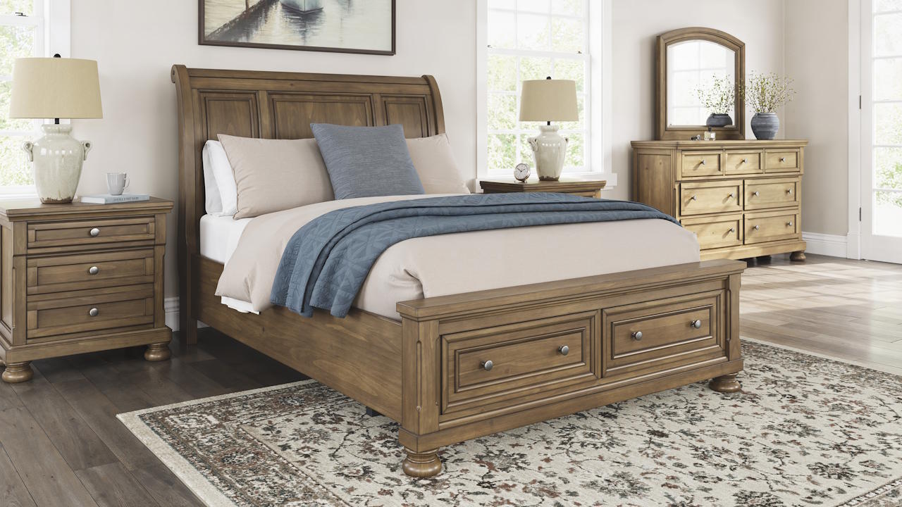 The Feddinger Queen Storage Sleigh Bedroom Set features a chestnut brown queen sleigh bed with built-in storage drawers, a seven-drawer dresser with mirror, and a matching nightstand—all crafted from pine solids and veneers with aged pewter-tone hardware and durable dovetail construction for timeless style and everyday functionality.