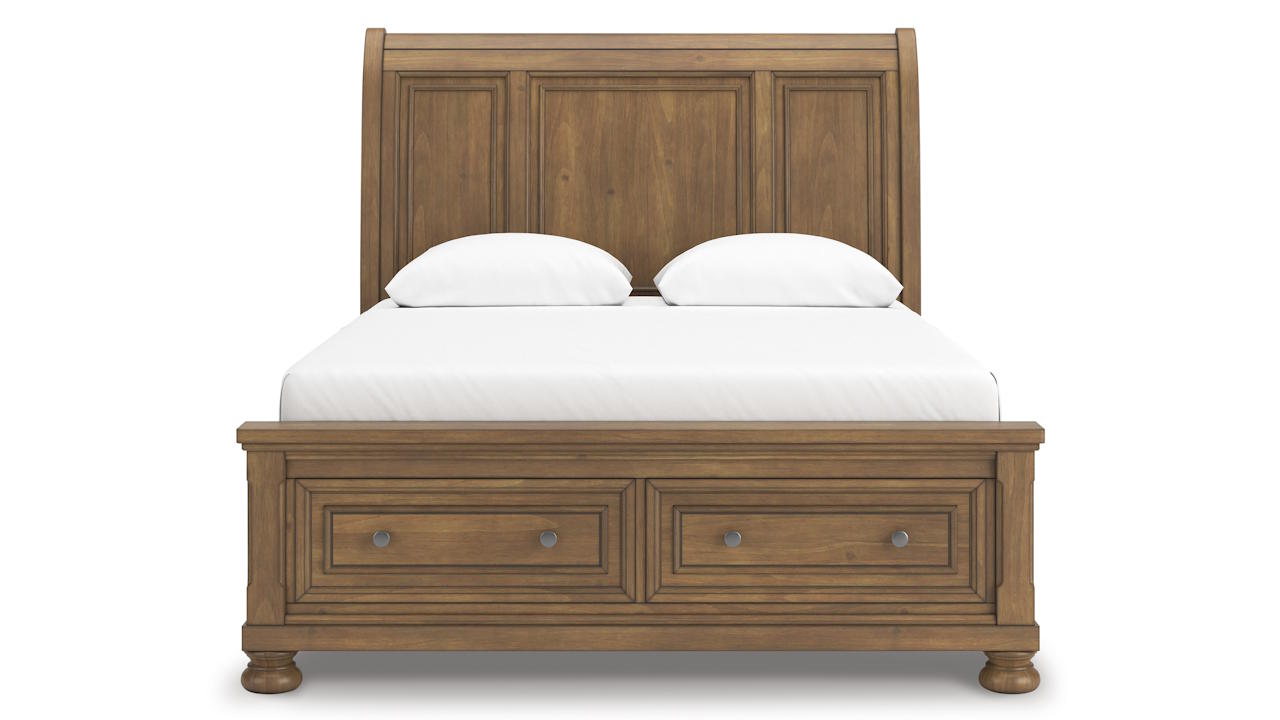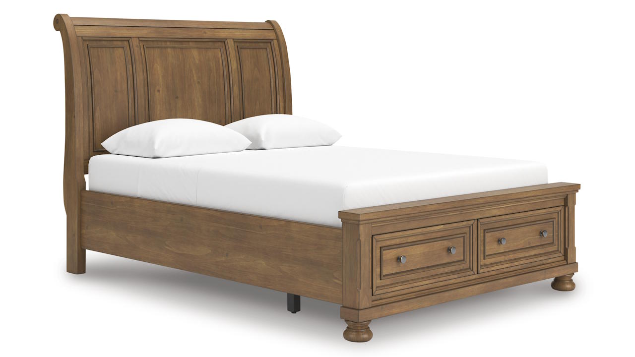 The Feddinger Queen Storage Sleigh Bed features a classic sleigh design in a chestnut brown finish with two footboard drawers, aged pewter-tone knobs, and sturdy hardwood construction.