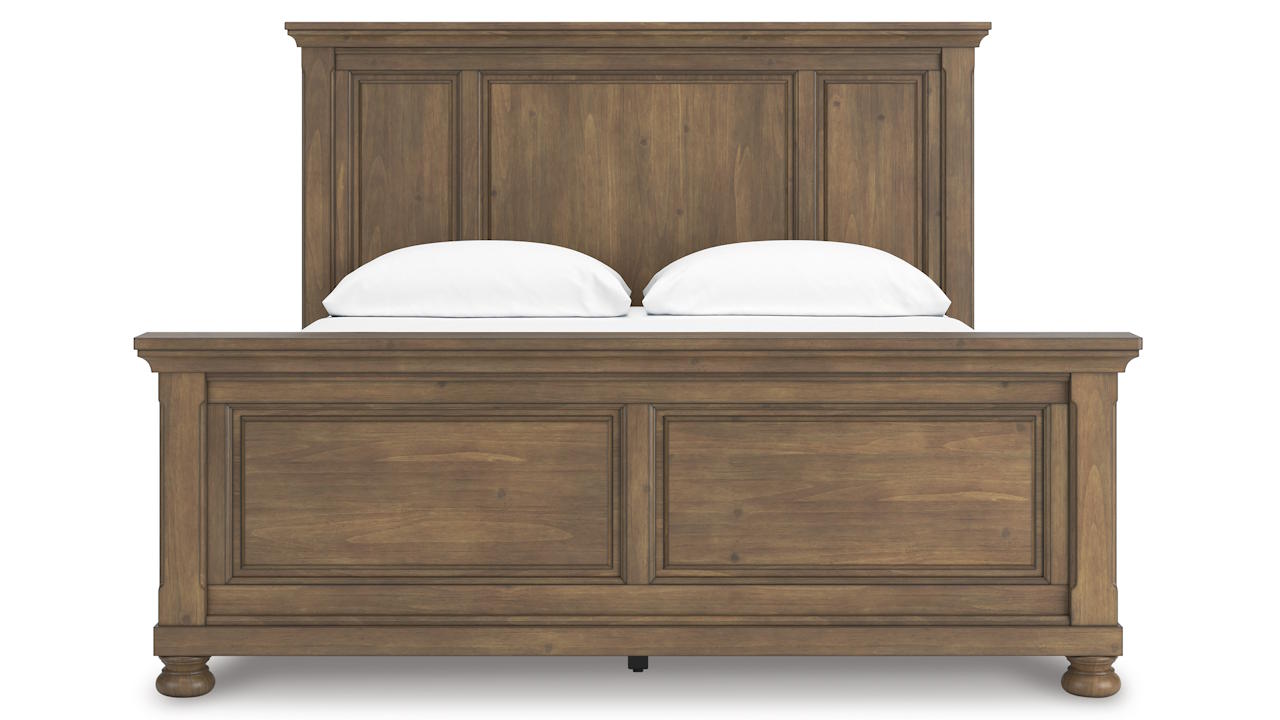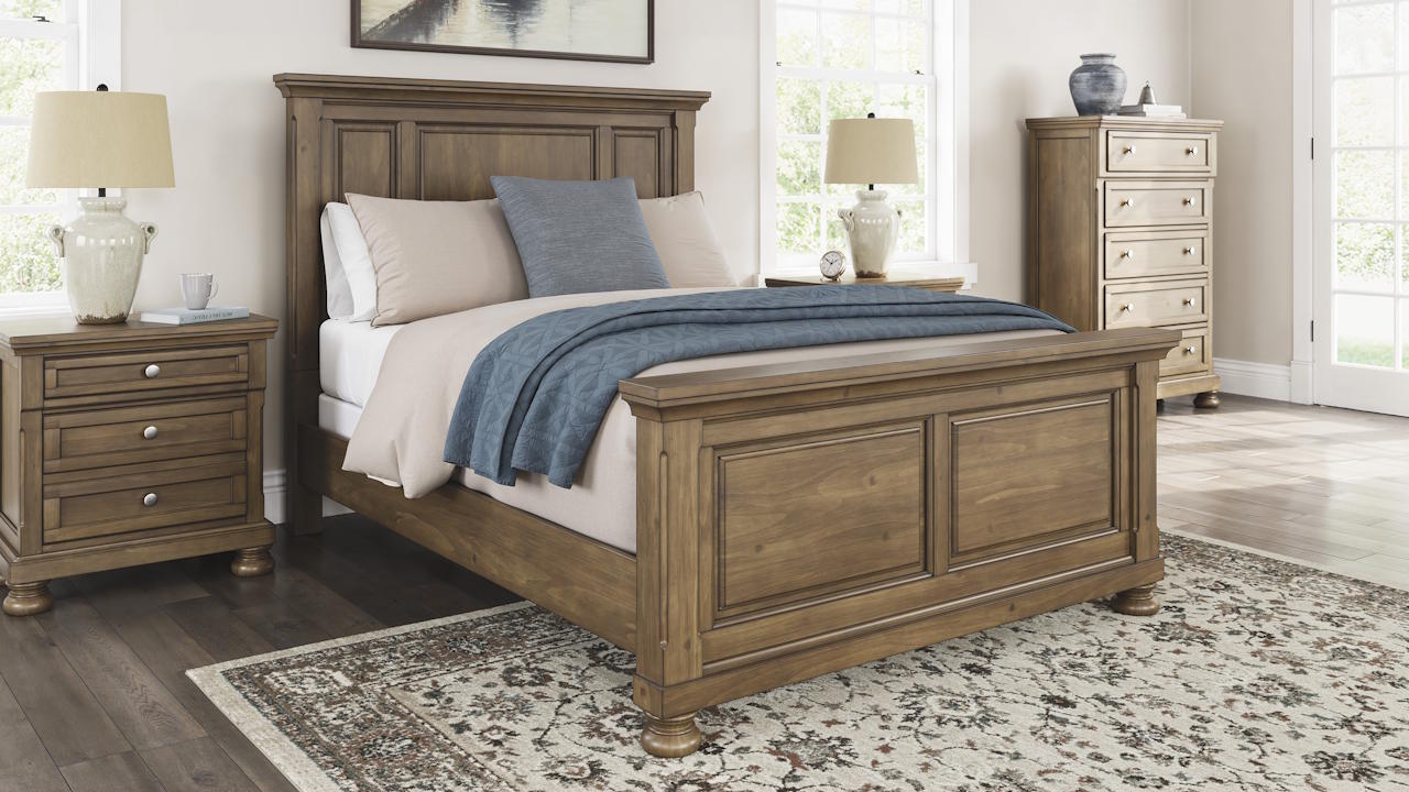 The Feddinger King Panel Bed features a timeless casual design with a chestnut brown finish, sturdy pine and veneer construction, and reinforced hardwood slat support.