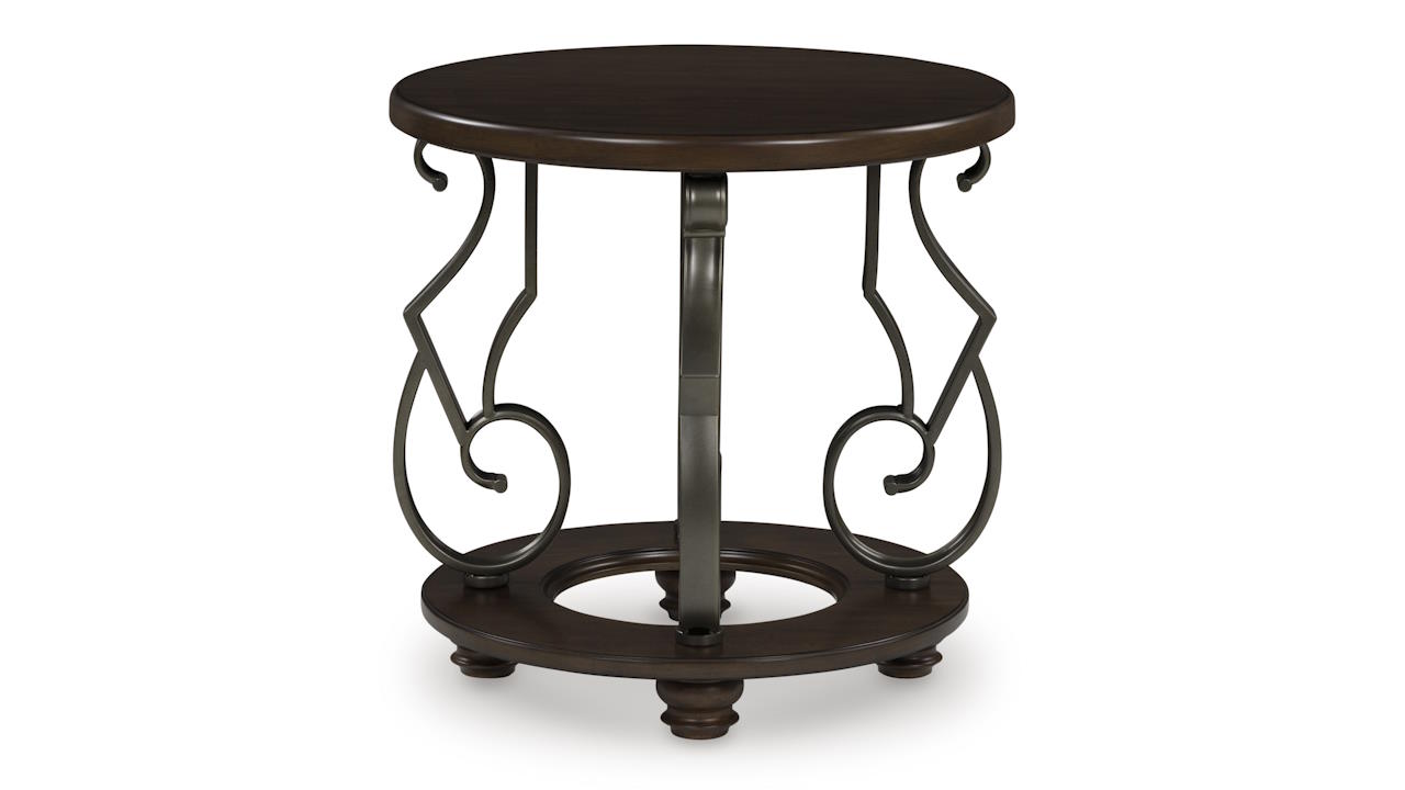 The Frallyn Round End Table features a rich brown finish, faux marble laminate top, and ornate metal legs with a dark pewter-tone powder coat, combining elegance and timeless sophistication.