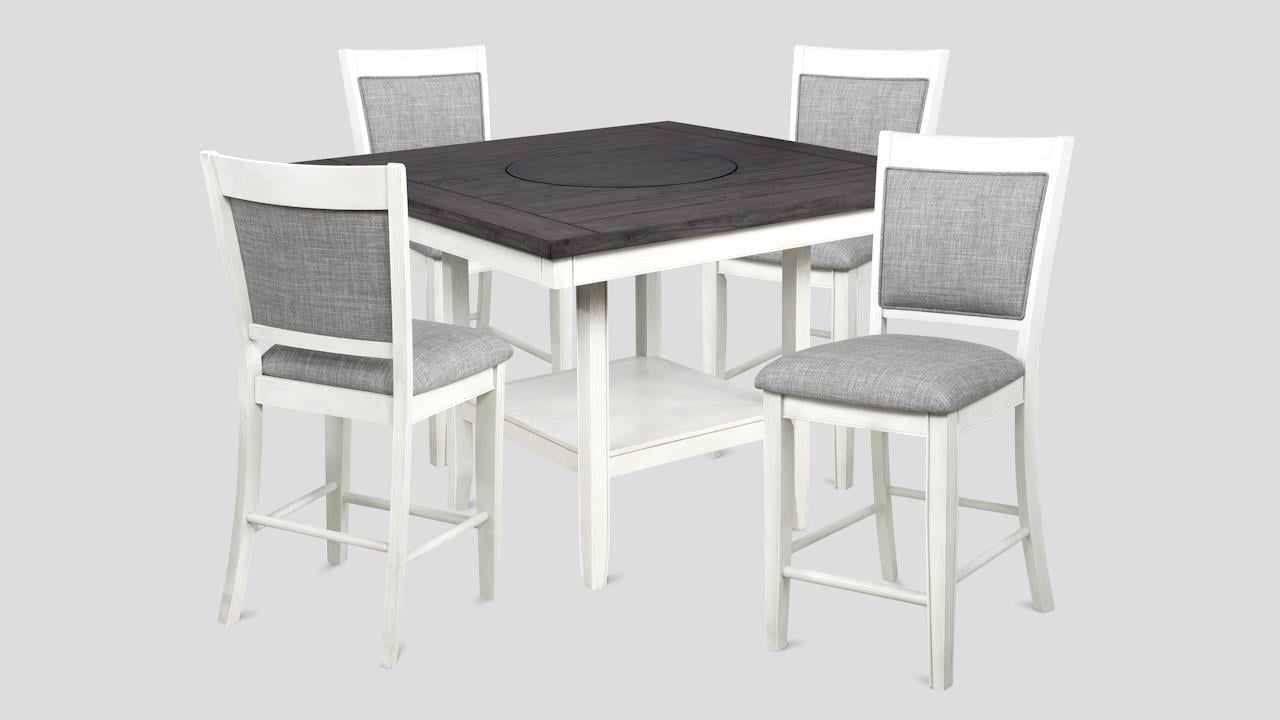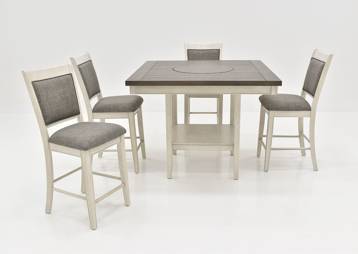 The simplistic design of the Fulton 5 Piece Counter Height Dining Table Set blends well with any home's decor. Featuring stylishly upholstered seating, a chalk gray finish, plenty of storage space beneath the tabletop, and a convenient lazy susan in the center of the table. The Fulton Dining Set will complete your family's dining experience with style and value! Price includes table and 4 barstools.