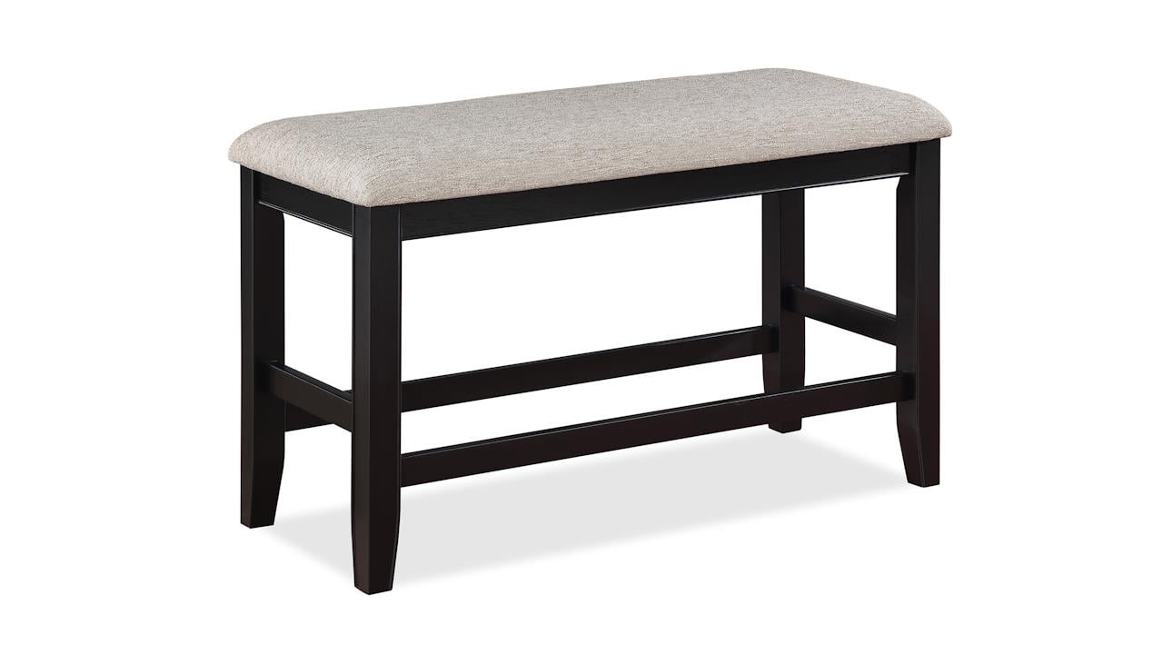 Introducing the Fulton 6-Piece Counter Dining Set in Black: a sleek, contemporary ensemble featuring a dark wooden table with clean lines, complemented by four cushioned chairs and a bench, all exuding both style and comfort, perfect for gatherings and memorable meals.