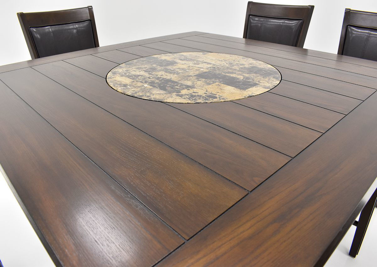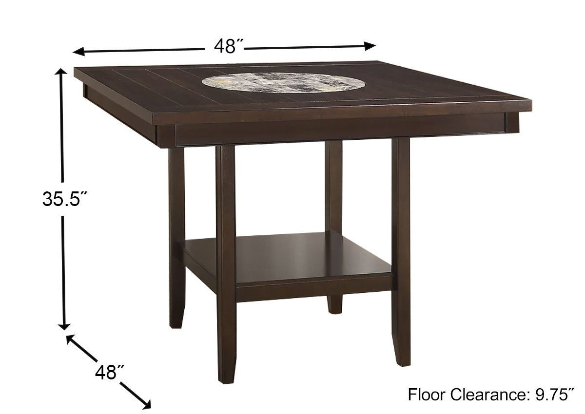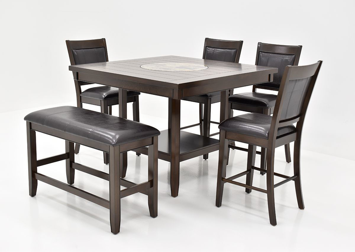 6 Piece Dining Table Set. Includes Table, Bench, and 4 Barstools. Dark Brown Finish. Upholstered Chairs and Bench. Lazy Susan and Storage.