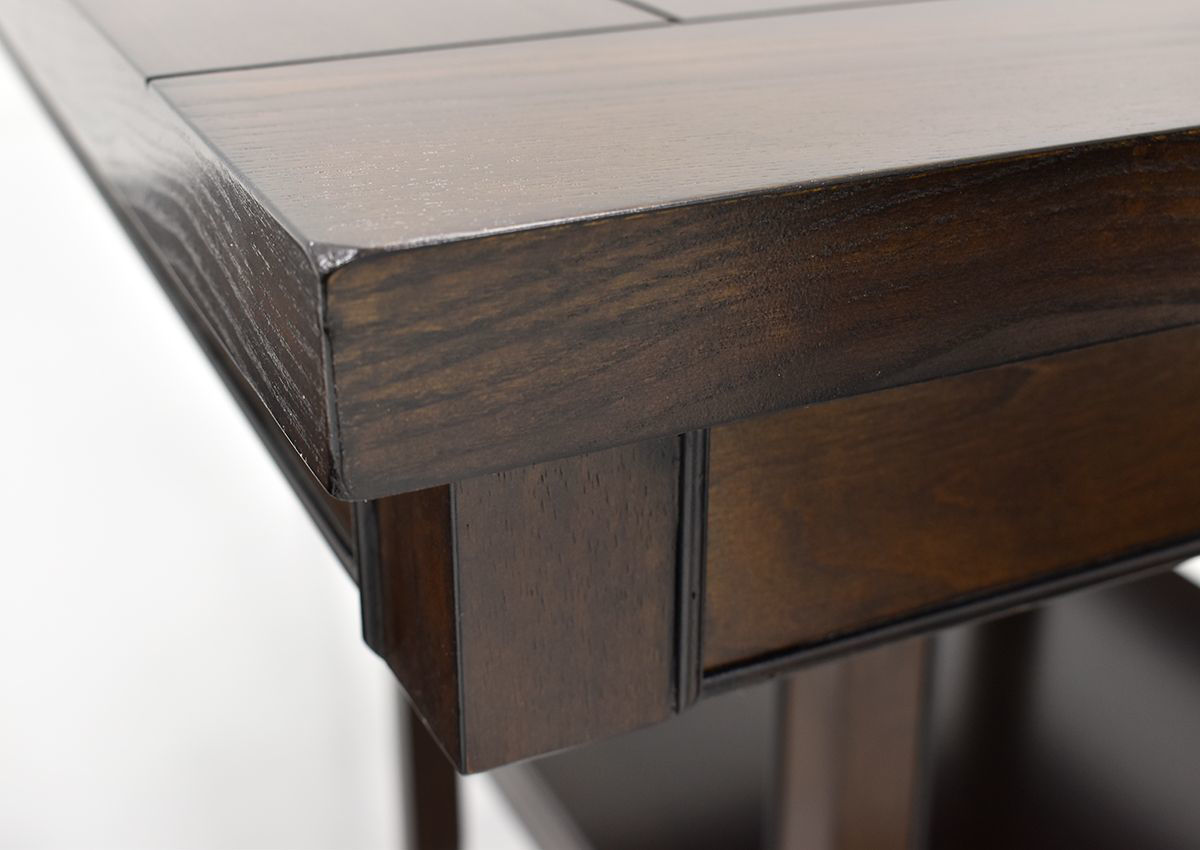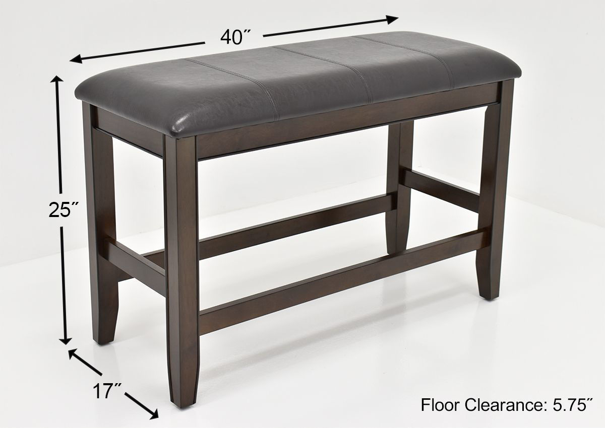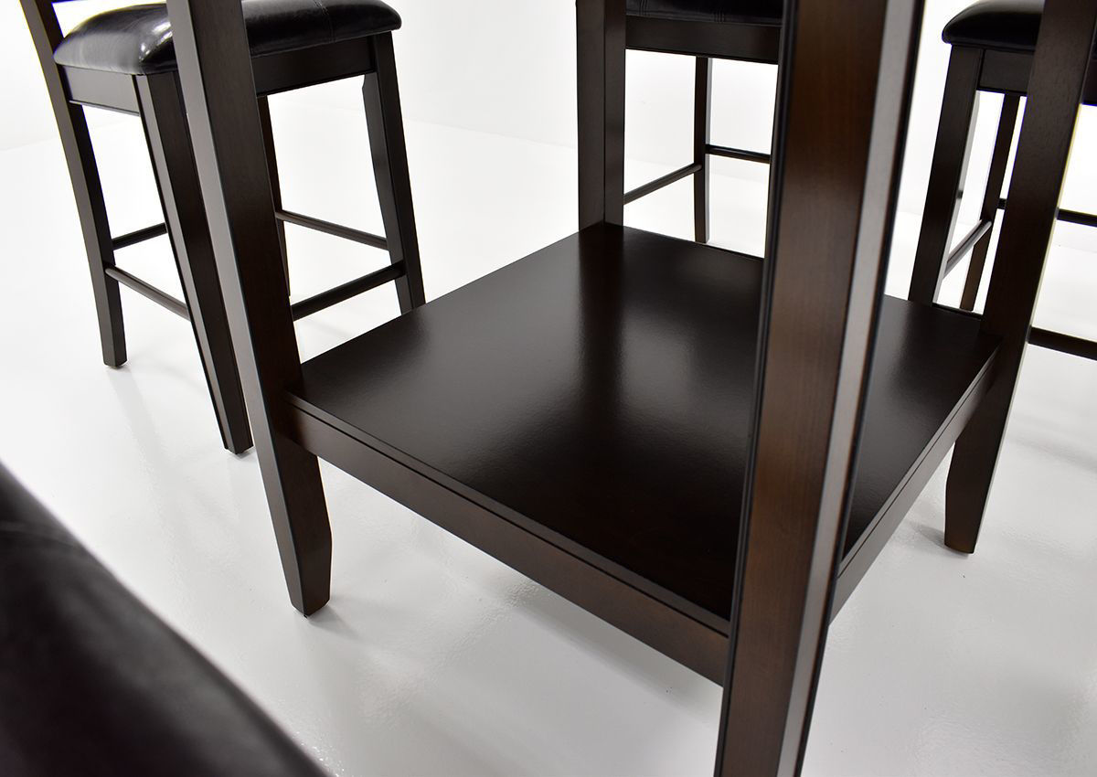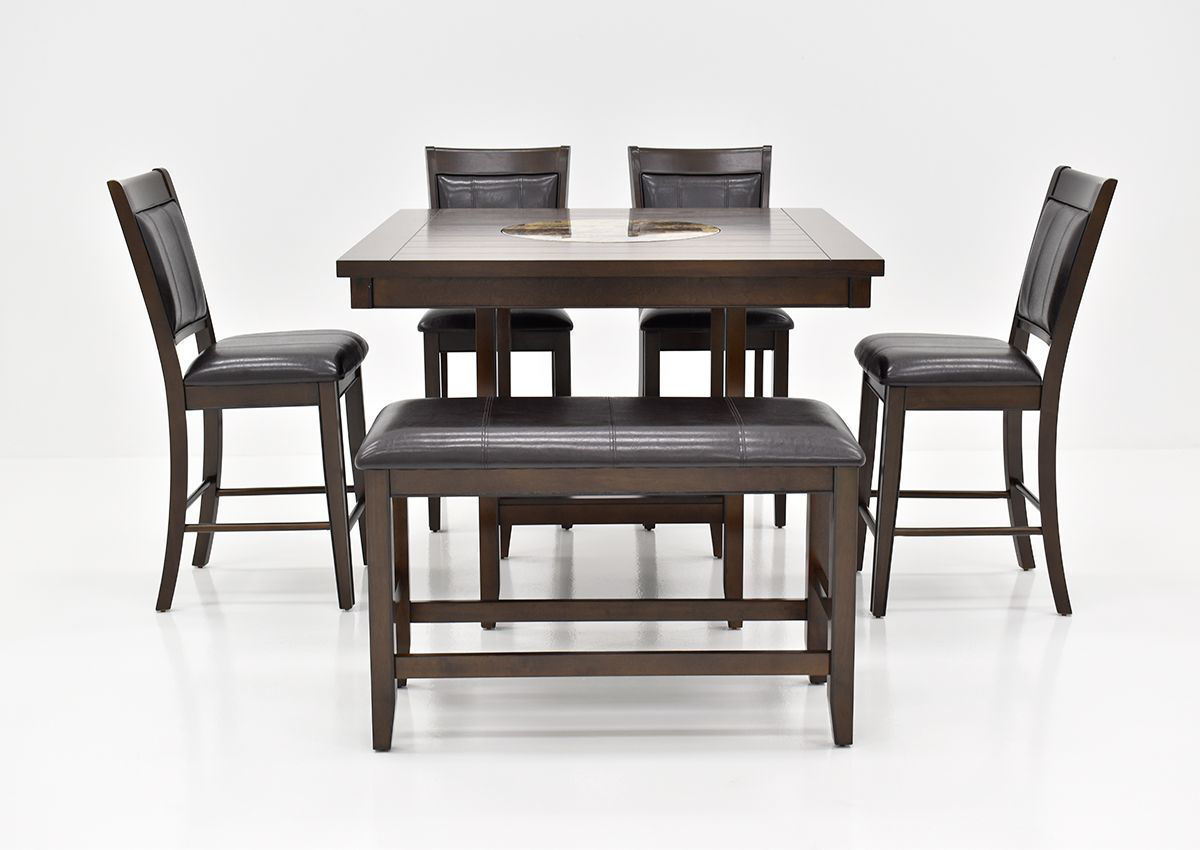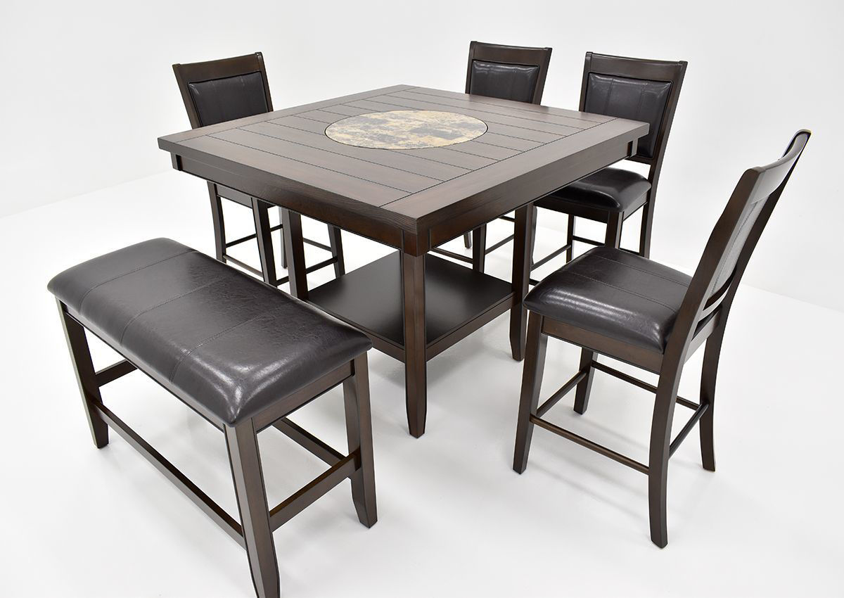 The simplistic design of the counter height Fulton 6 Piece Dining Table Set with Bench blends well with any home's decor. Featuring stylishly upholstered barstools with chair backs and bench that are covered in a rich brown finish. A built-in Lazy Susan on the tabletop and the storage space beneath bring a touch of convenience and functionality to the Fulton Dining Collection. Fulton 6 Piece Dining Table Set price includes table, bench, and 4 barstools.