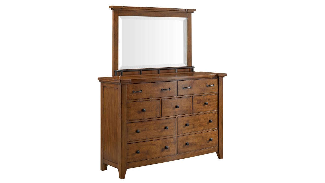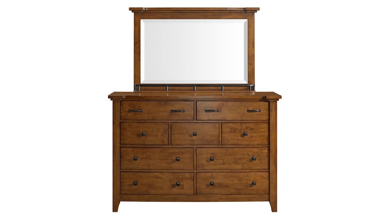 The Gage Dresser & Mirror Set in Chestnut blends traditional style with durable craftsmanship, featuring dovetailed drawers, a beveled mirror, and safety-conscious design.