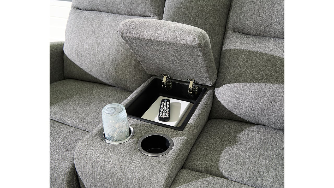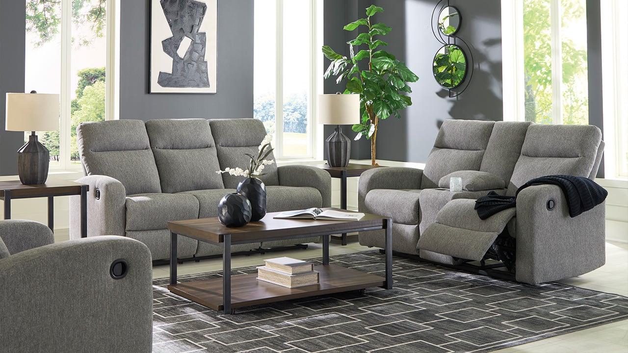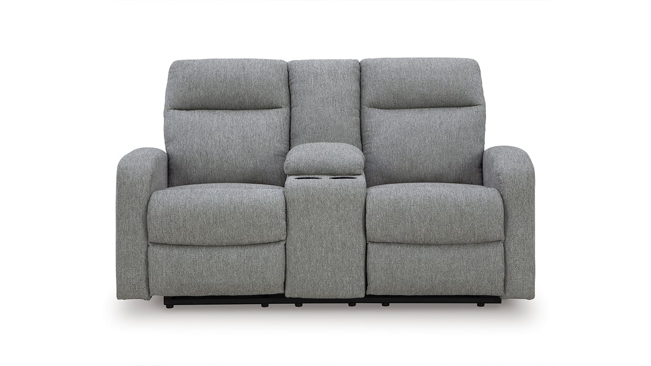Relax into everyday comfort with the Gauntlet Reclining Loveseat in sterling gray. Designed with a clean, classic look and an easygoing neutral tone, it blends seamlessly into your space while delivering simple, reliable comfort. Effortless pull-tab reclining and a built-in console make it easy to unwind and keep essentials close at hand.