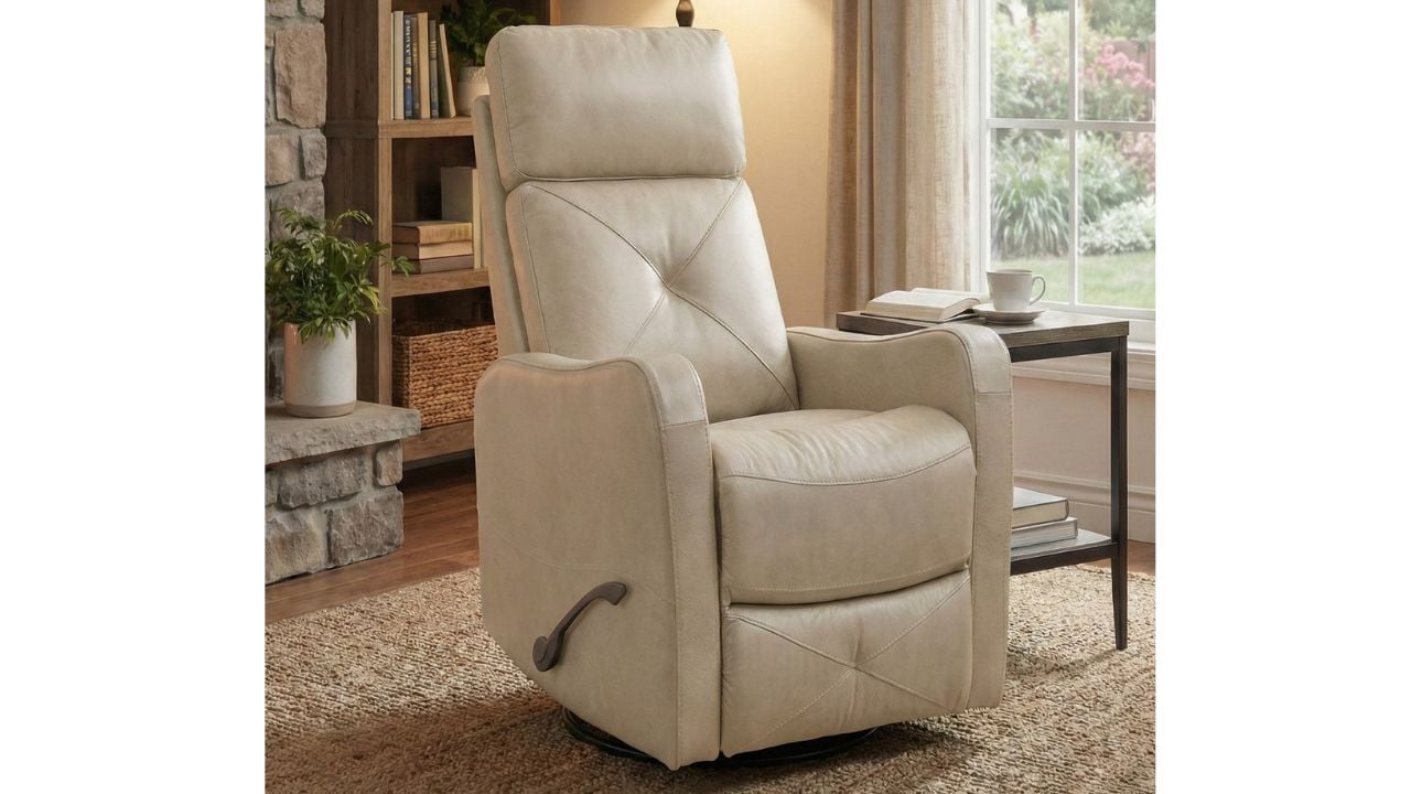 Cream Swivel Recliner. Curved Handle for Easy Reclining. Leather Upholstery. Seat to Feet Padding.