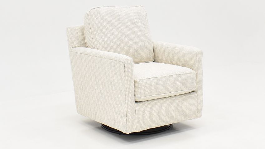 Looking for designer furniture to liven up your entertainment? Look no further than the Hogan Swivel Glider in Off-White by Fusion. This off-white swivel chair is accented with beautiful hues of pale cream tinted with light caramel that create a relaxing vibe. The cushioned seat adds functionality and comfort to this piece.You and your family will love the Hogan thanks to its welcoming style and durable Revolution Performance Fabric. The soft upholstery is stain-resistant, easy to clean, and sourced and woven in the USA.
