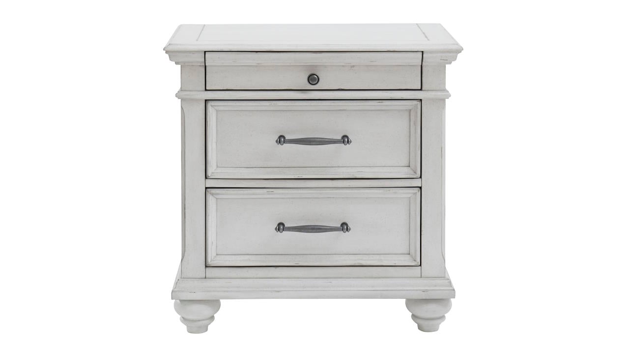 Elevate your bedroom with the Kanwyn Queen Panel Bedroom Set in White, featuring a queen bed, nightstand, and dresser with mirror beautifully distressed whitewash finish, grand-style headboard, and durable solid wood construction.
