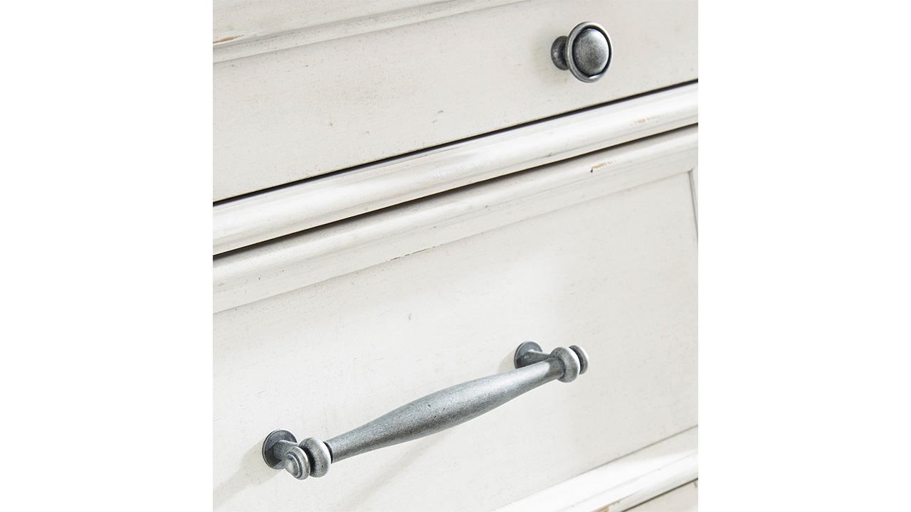 Elevate your bedroom with the Kanwyn King Panel Bedroom Set in White, featuring a king bed, nightstand, and dresser with mirror beautifully distressed whitewash finish, grand-style headboard, and durable solid wood construction.