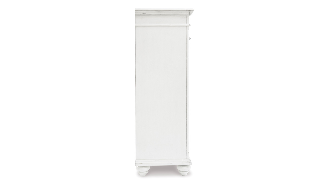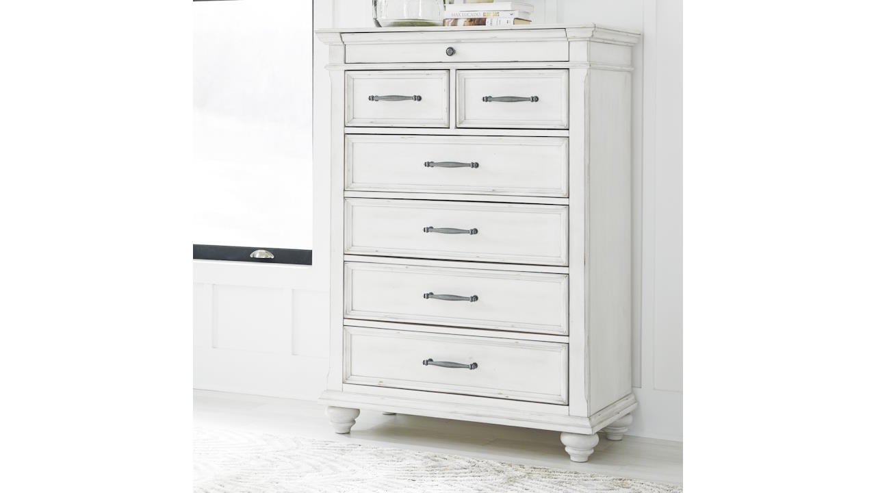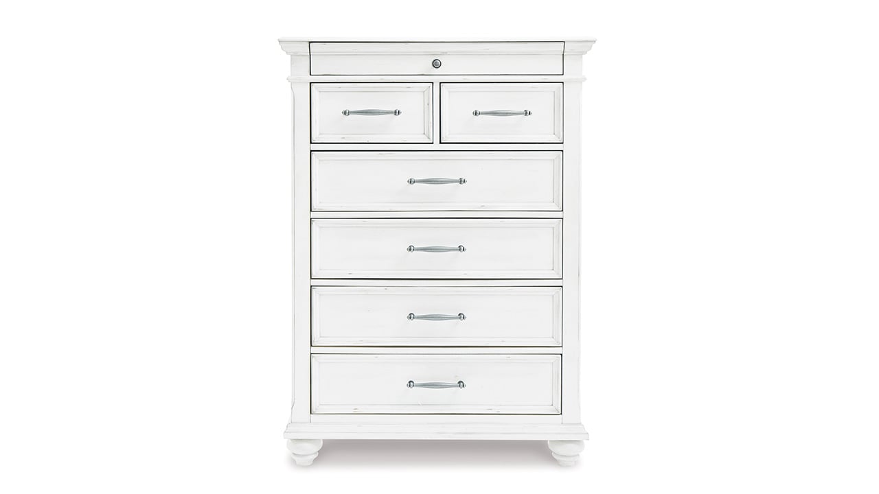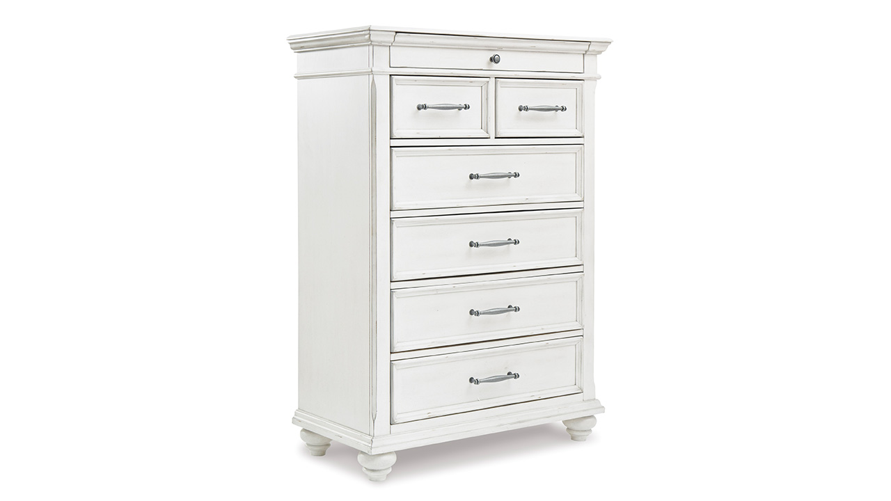 Elevate your bedroom with the Kanwyn King Panel Bedroom Set in White, featuring a king bed, nightstand, and dresser with mirror beautifully distressed whitewash finish, grand-style headboard, and durable solid wood construction.
