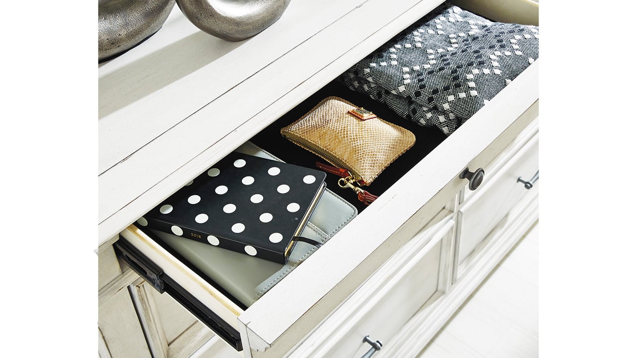 Elevate your bedroom with the Kanwyn King Panel Bedroom Set in White, featuring a king bed, nightstand, and dresser with mirror beautifully distressed whitewash finish, grand-style headboard, and durable solid wood construction.