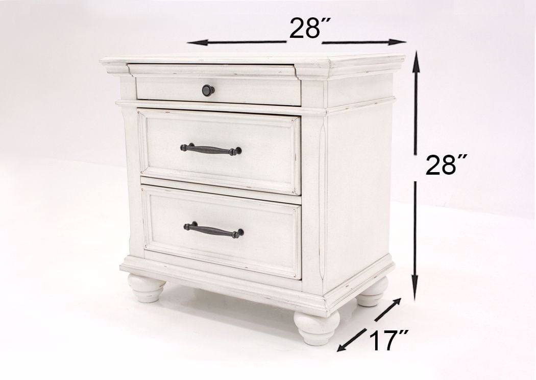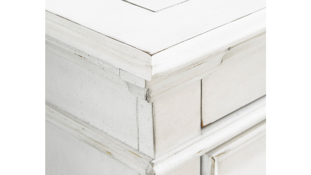 Elevate your bedroom with the Kanwyn King Panel Bedroom Set in White, featuring a king bed, nightstand, and dresser with mirror beautifully distressed whitewash finish, grand-style headboard, and durable solid wood construction.
