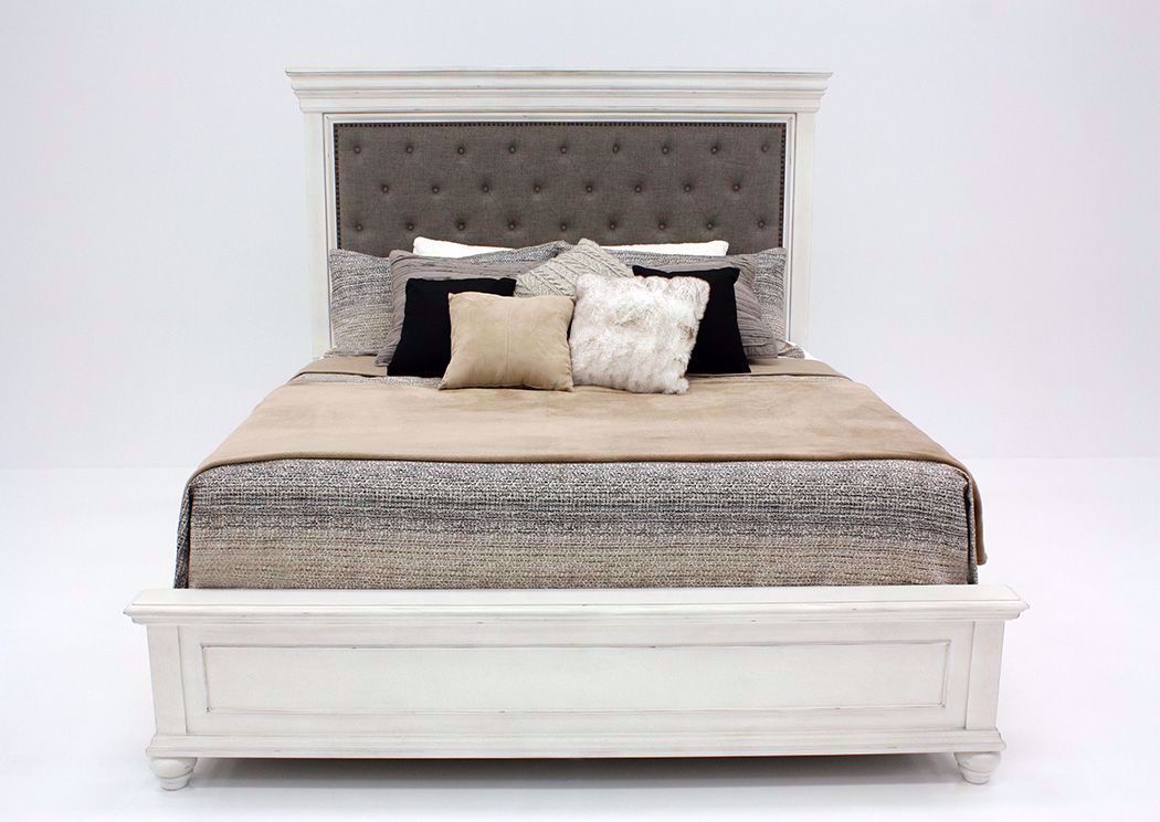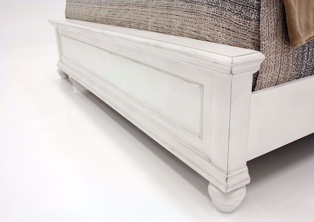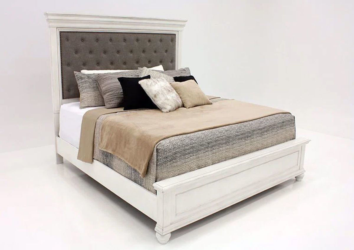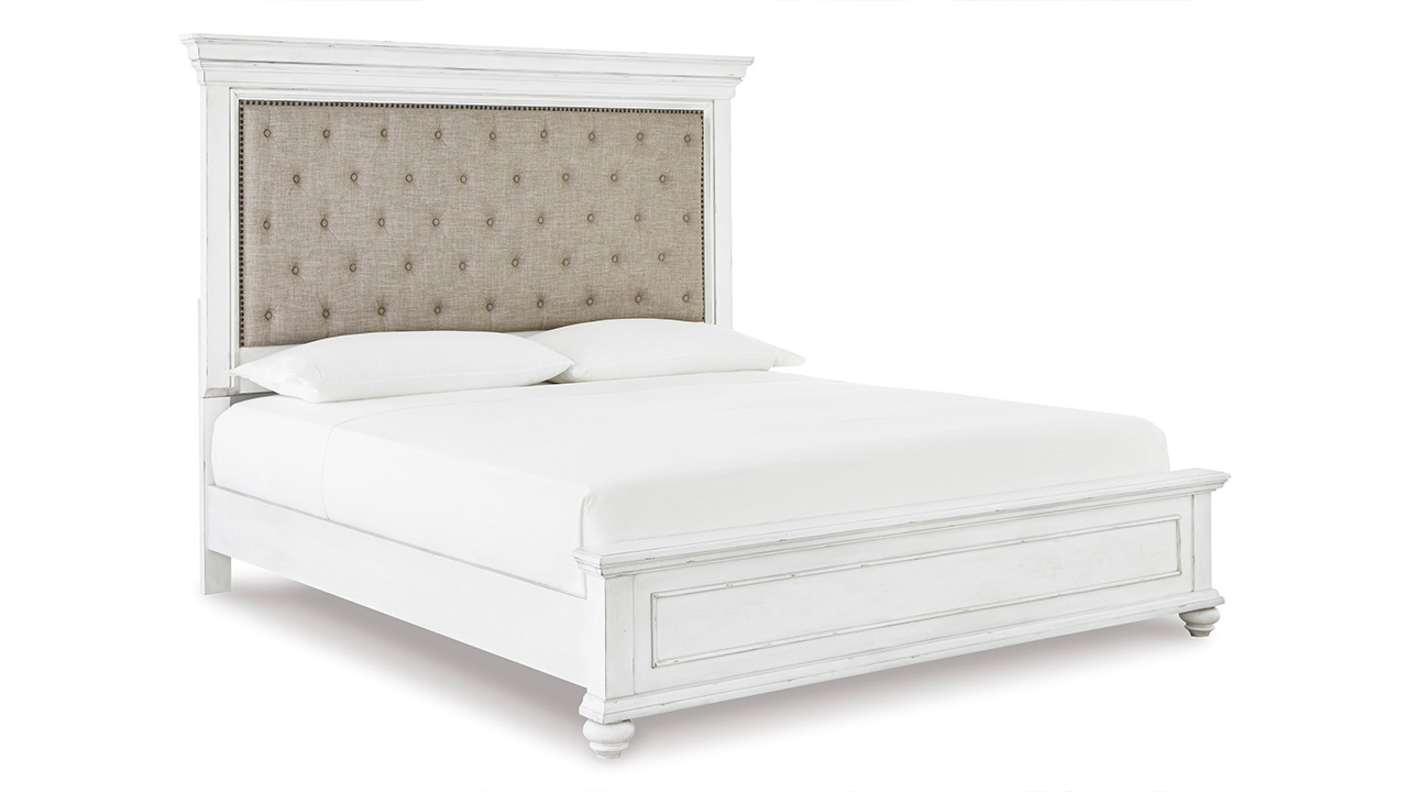 The Kanwyn King Panel Bed in White exudes vintage charm with its beautifully distressed whitewash finish, grand headboard featuring a picture-framed panel, and character-filled design reminiscent of a quaint cottage escape, crafted with solid wood, veneers, and engineered wood.