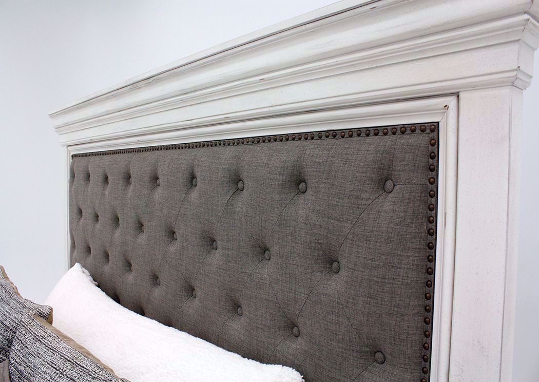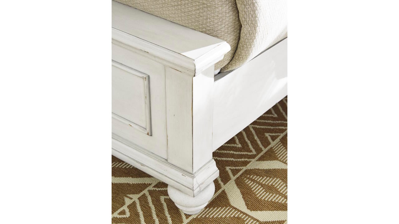 Elevate your bedroom with the Kanwyn King Panel Bedroom Set in White, featuring a king bed, nightstand, and dresser with mirror beautifully distressed whitewash finish, grand-style headboard, and durable solid wood construction.