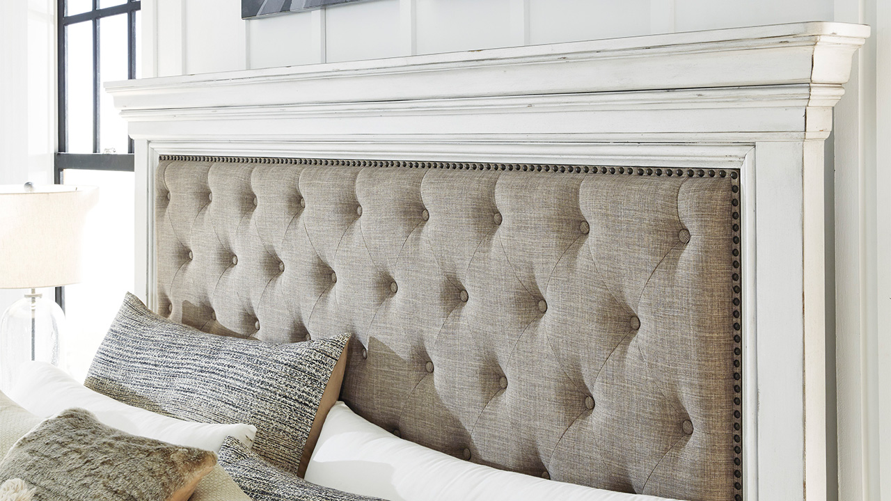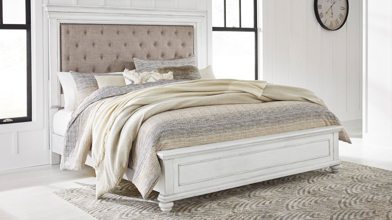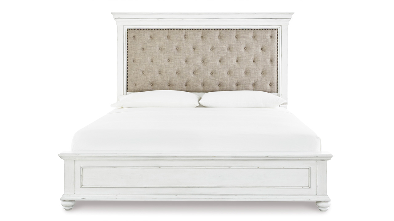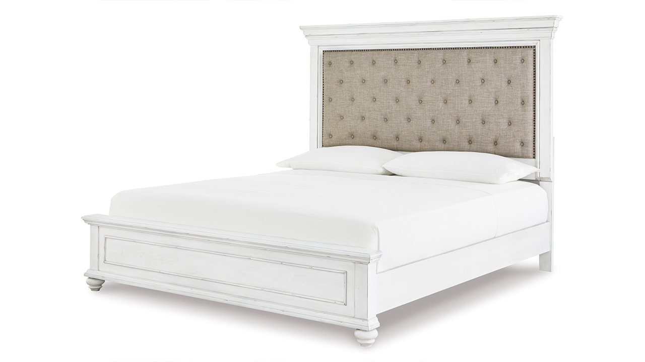 The Kanwyn King Panel Bed in White exudes vintage charm with its beautifully distressed whitewash finish, grand headboard featuring a picture-framed panel, and character-filled design reminiscent of a quaint cottage escape, crafted with solid wood, veneers, and engineered wood.