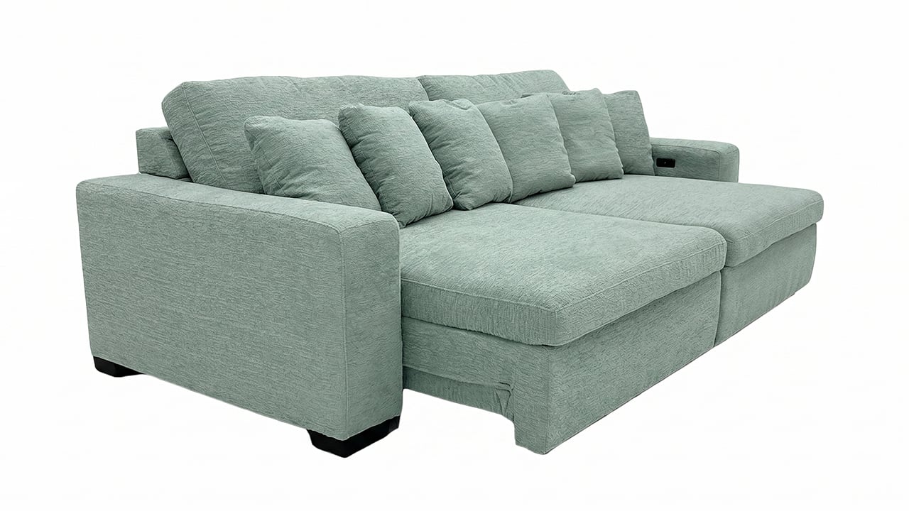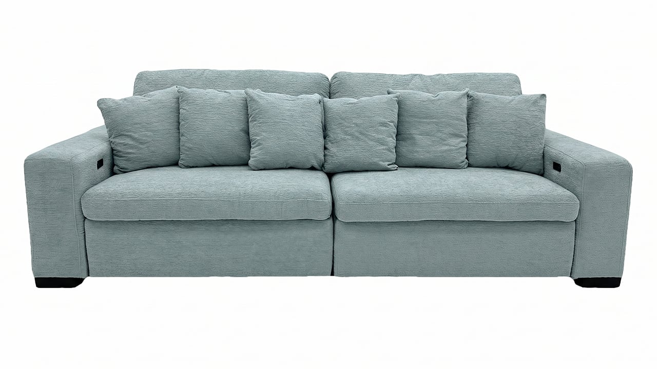Calm and contemporary, the Katy Power Slider Chair in lotus blue adds a soft pop of color to your living space. Its minimalist form is elevated by an adjustable sliding chaise for flexible comfort, while deep cushions and coordinating back pillows invite you to unwind. Sleek black legs ground the look, and a built-in USB charging port ensures modern convenience is always within reach.