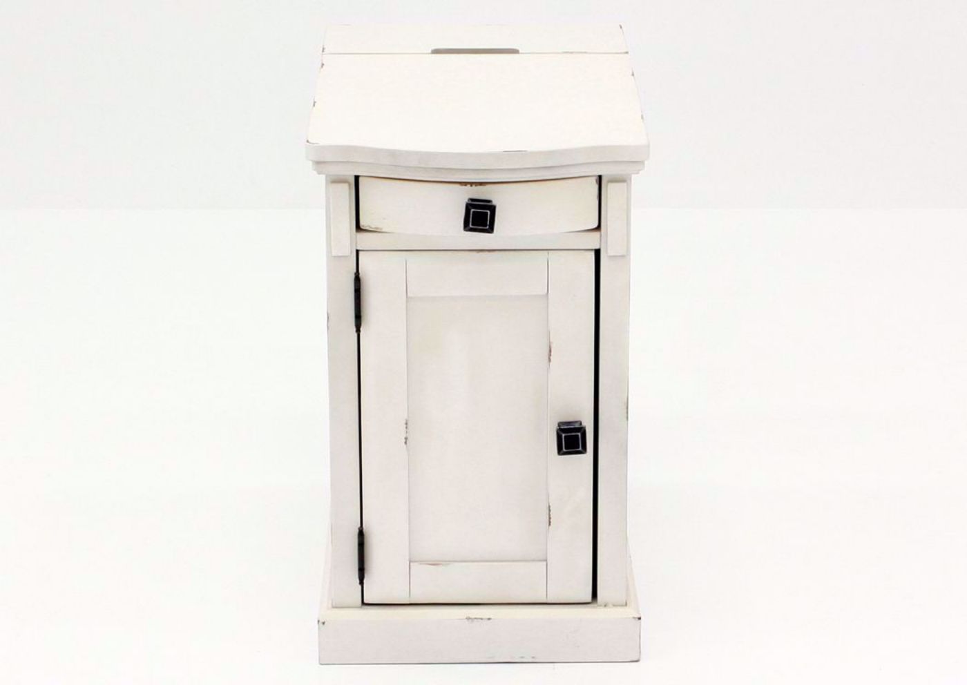 The charmingly rustic white Laflorn Chairside End Table by Ashley Furniture is the perfect addition to your home or office. Features include a beautiful white finish with a flip-up top that reveals AC power and USB charging ports. You’ll also appreciate the cup holders and magazine rack on the back.