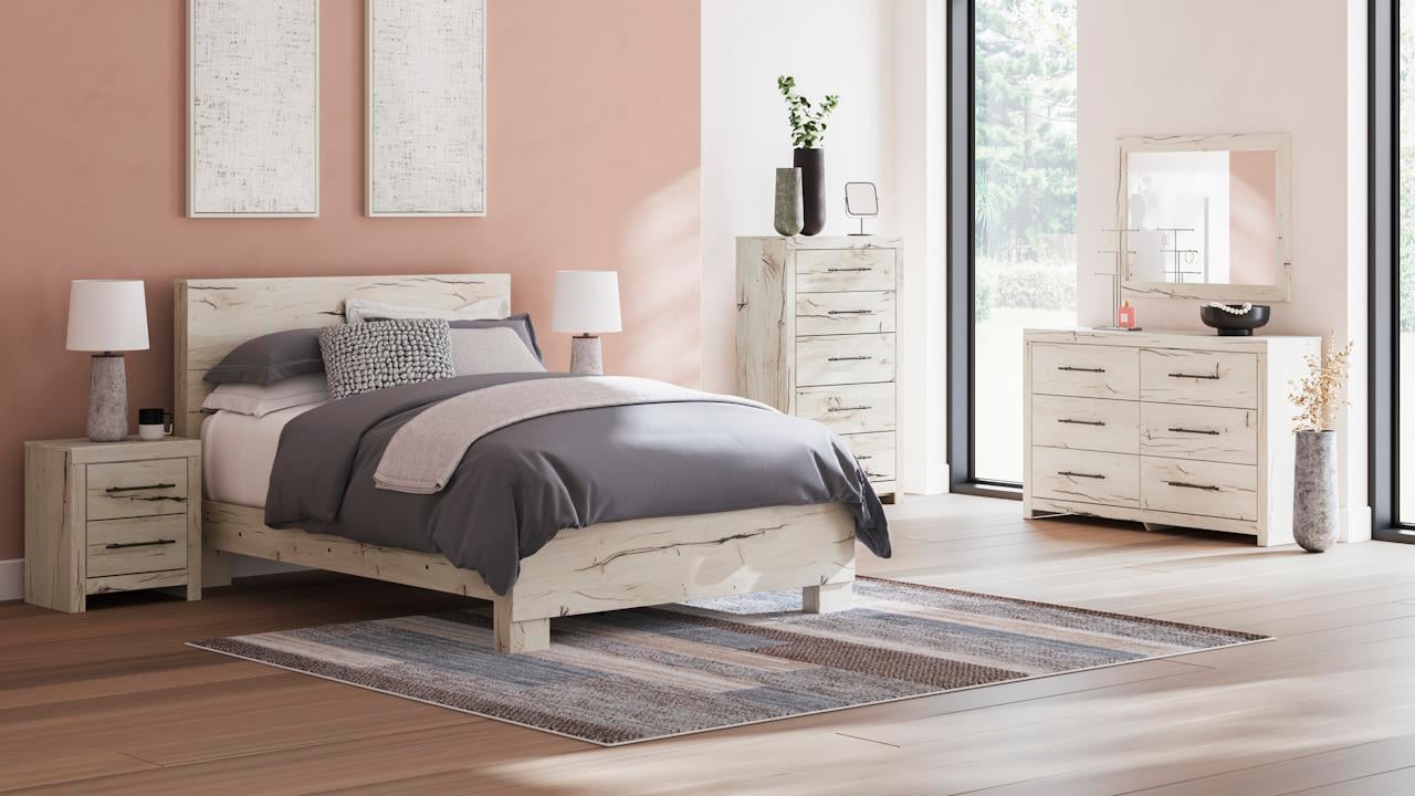 The Lawroy King Panel Bedroom Set in Off White, featuring a king bed, dresser with mirror, and nightstand, seamlessly blends farmhouse charm with contemporary style through its rustic white finish and replicated reclaimed oak grain, offering both aesthetic appeal and functional durability.
