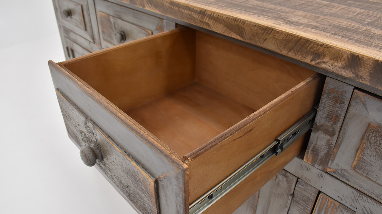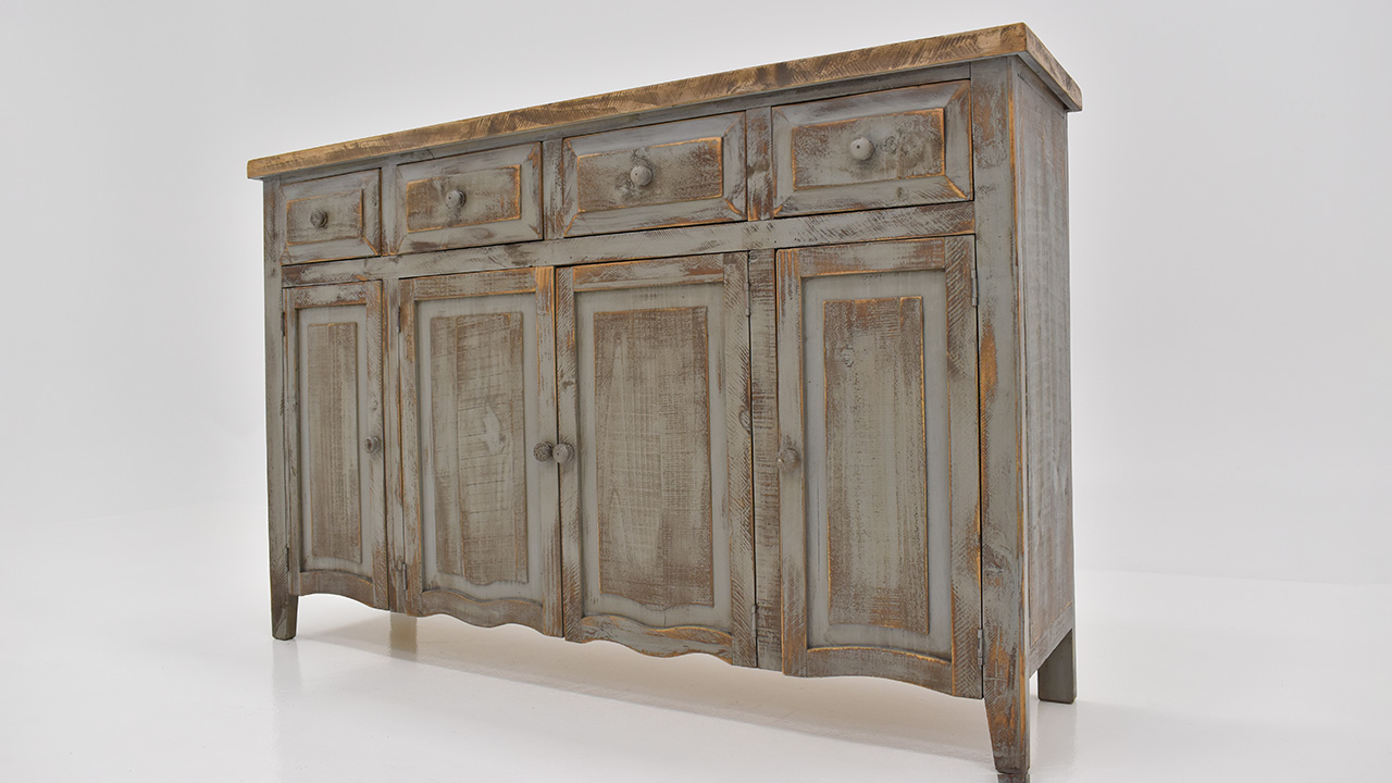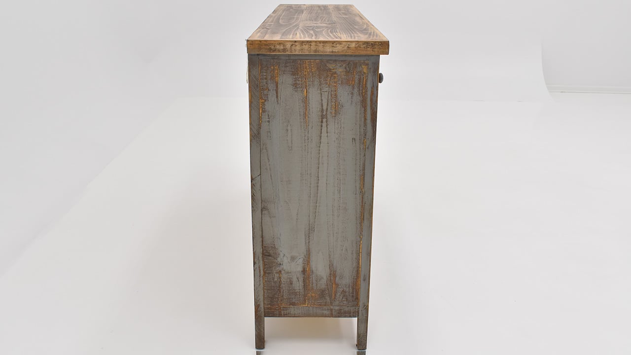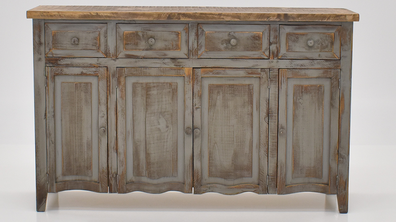 The Lexie 4-Drawer 4-Door Console in Off White is a rustic yet contemporary wooden console table with a distressed gray top, featuring four drawers and four cabinets with simple rounded handles, and a geometric pattern on the front for added visual interest.