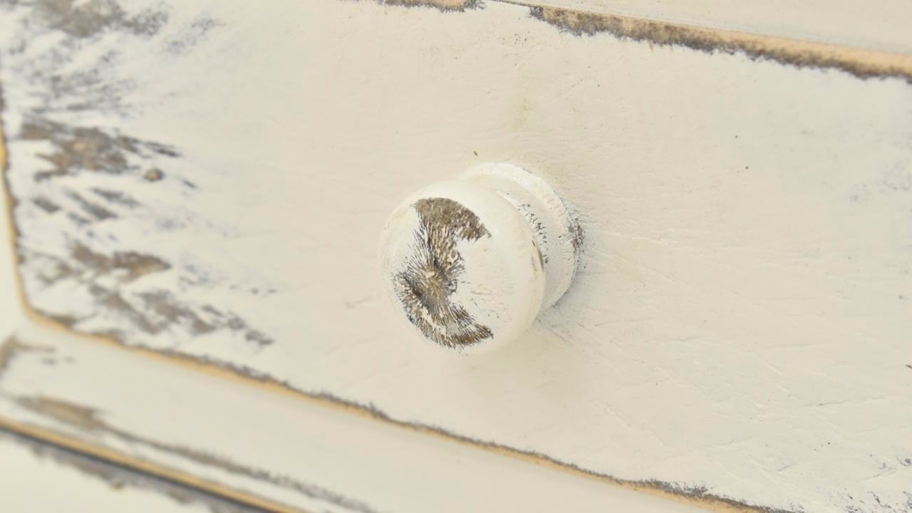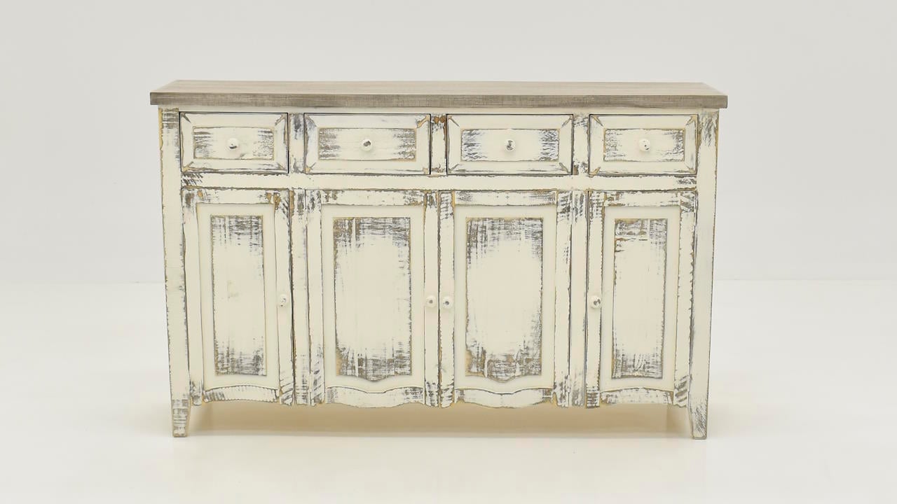 The Lexie 4-Drawer 4-Door Console in Off White is a rustic yet contemporary wooden console table with a distressed gray top, featuring four drawers and four cabinets with simple rounded handles, and a geometric pattern on the front for added visual interest.