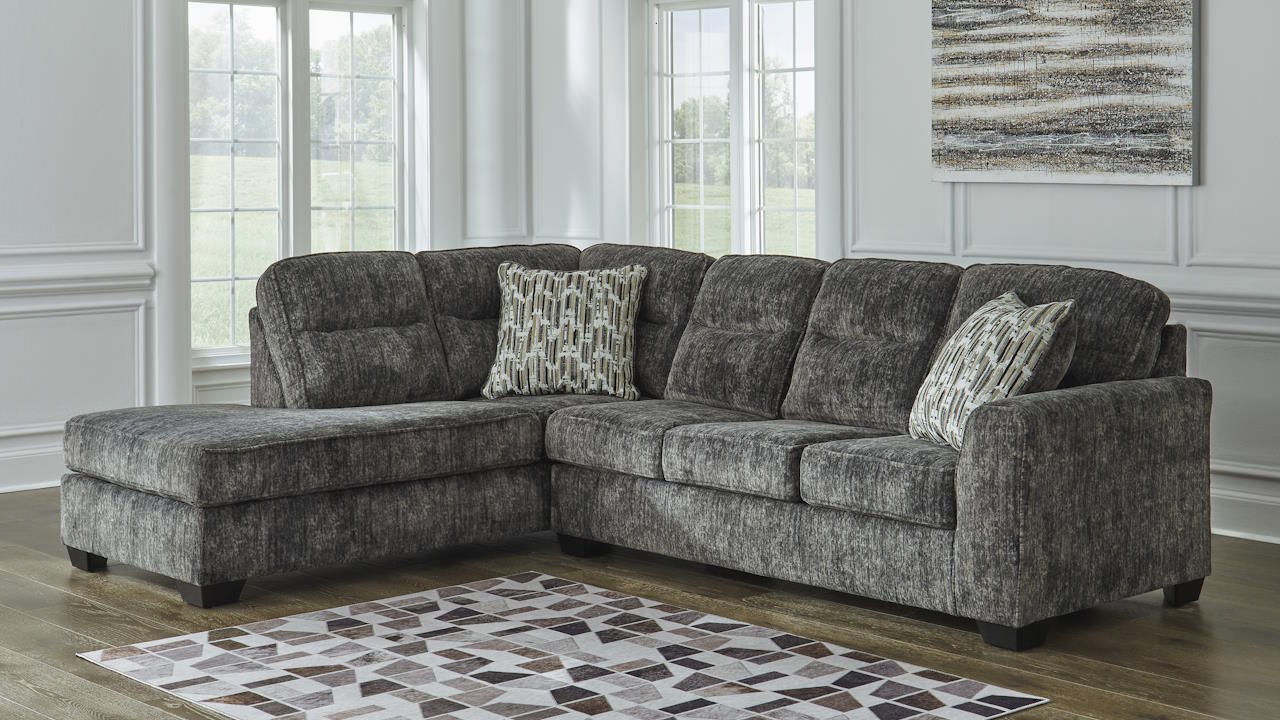 The Lonoke Sectional with Left Chaise in Gray by Ashley speaks to those drawn to fresh, contemporary style with richly neutral appeal. Subtle and sophisticated, the plush upholstery and dark tri-block legs are a natural complement for so many color schemes. On-trend track arms provide great support. Curling up on this sectional to enjoy a night in is never out of the question.