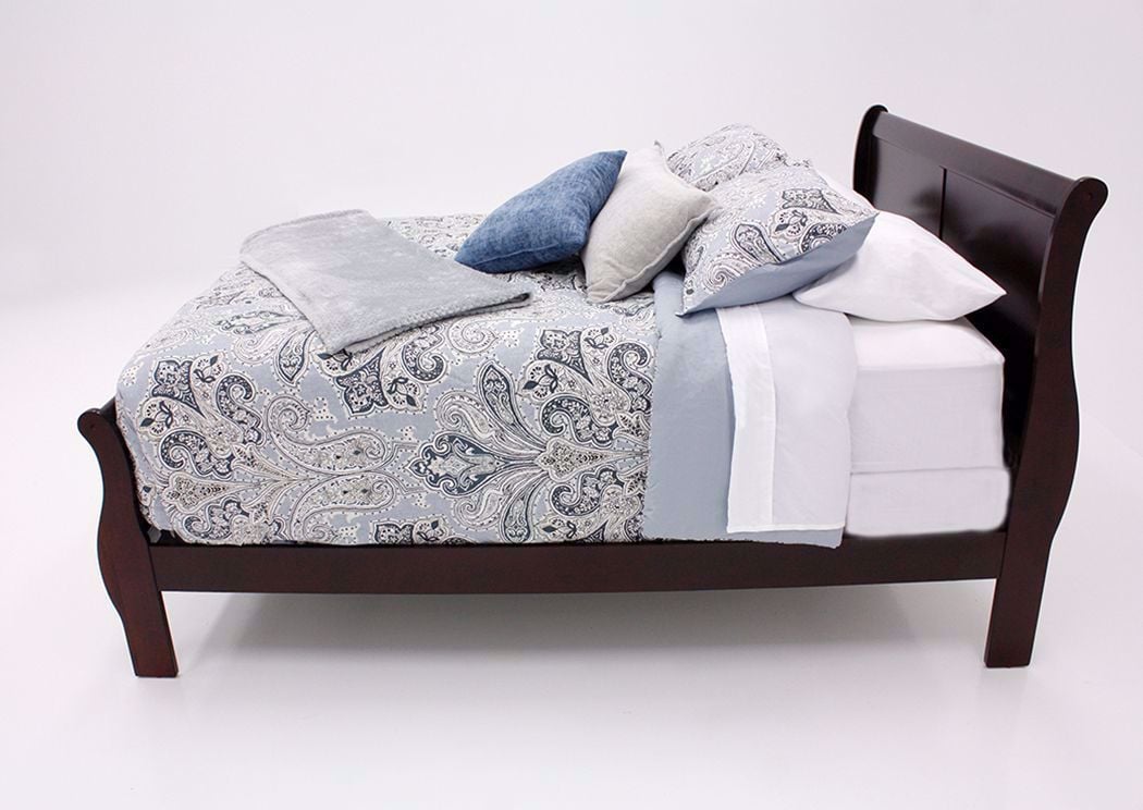 The Louis Philippe King Size Bed is made of quality wood solids and veneers. Shapely curves and classic styling. The beautiful sleigh style headboard and footboard have a cherry brown finish.