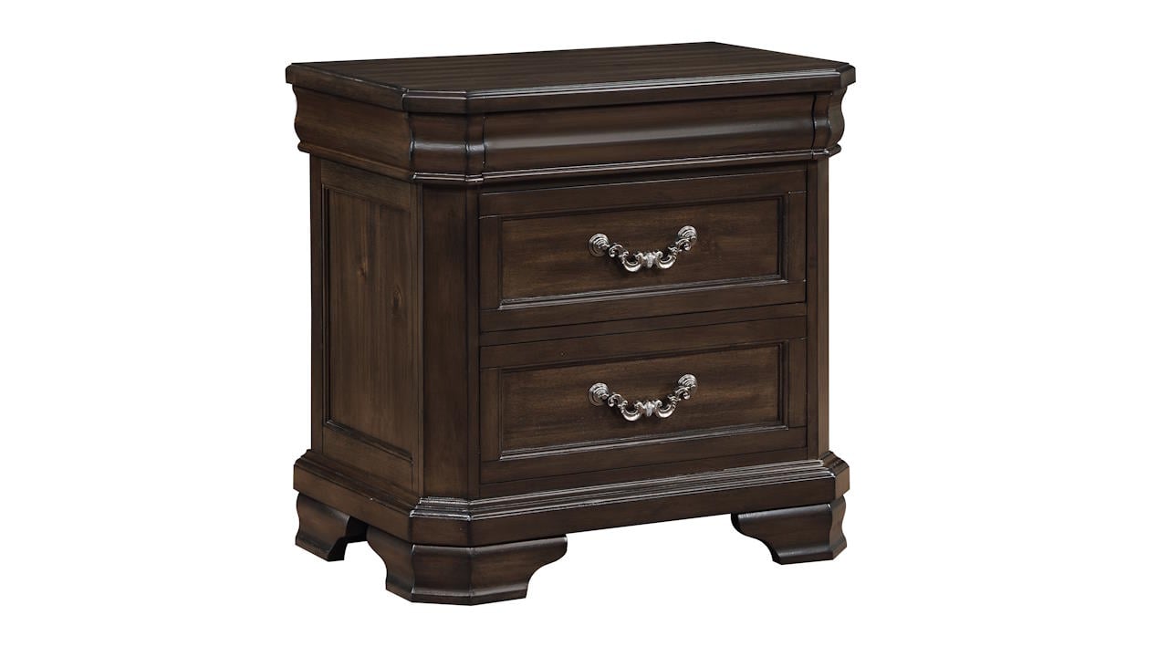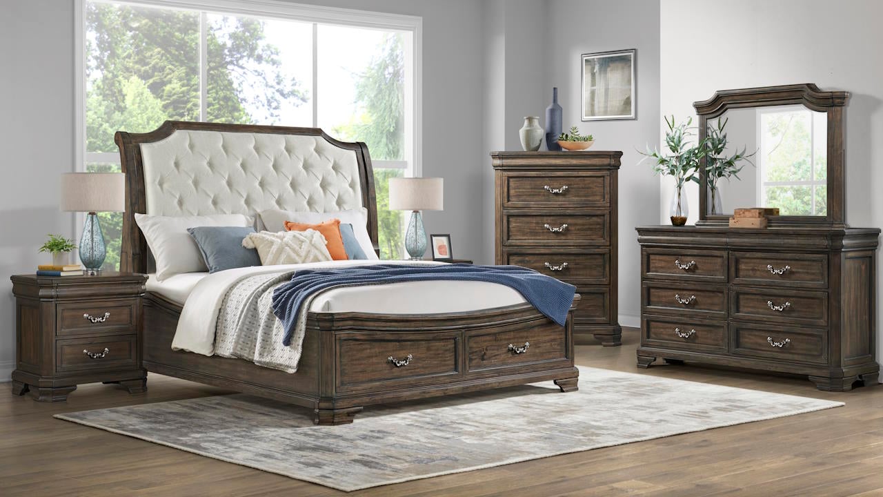 The Lyndhurst Queen Storage Bedroom Set in Brown combines a luxurious tufted headboard, dark wood nightstand, and dresser with an attached mirror to create a timeless and serene retreat.