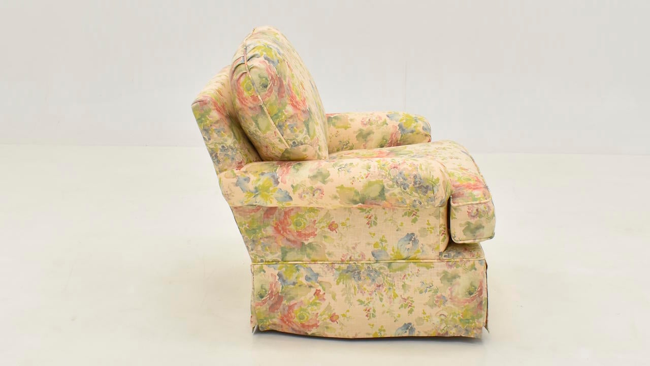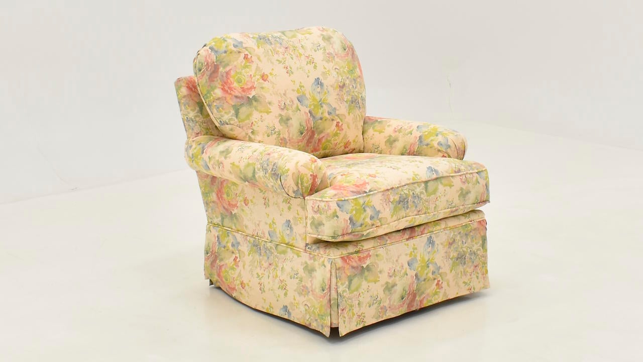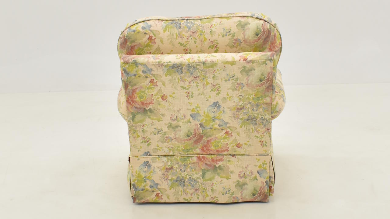 The Macbeth Blush Swivel Chair features a cozy, vintage design with multicolored floral upholstery and a concealed swivel base for classic comfort and charm.