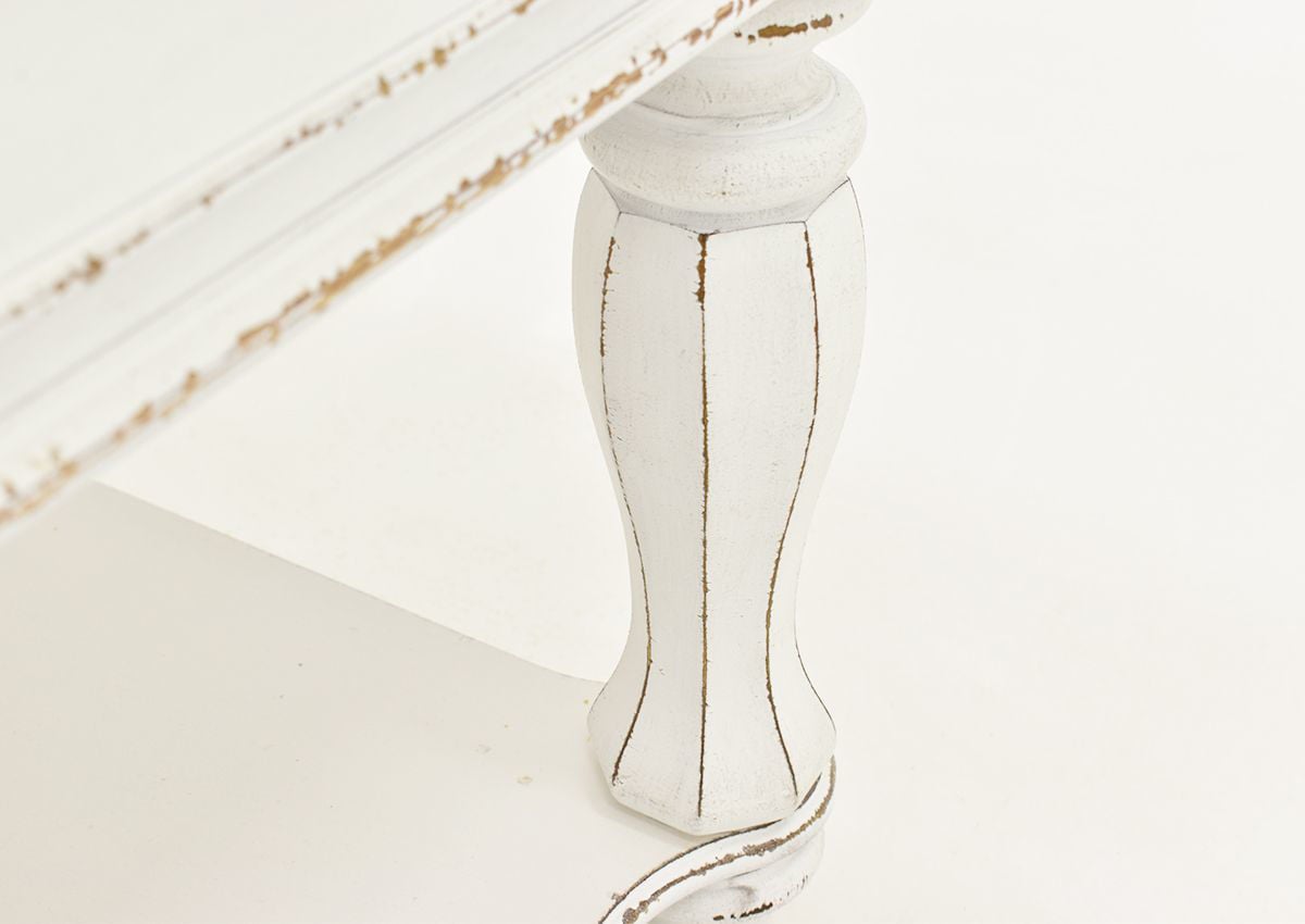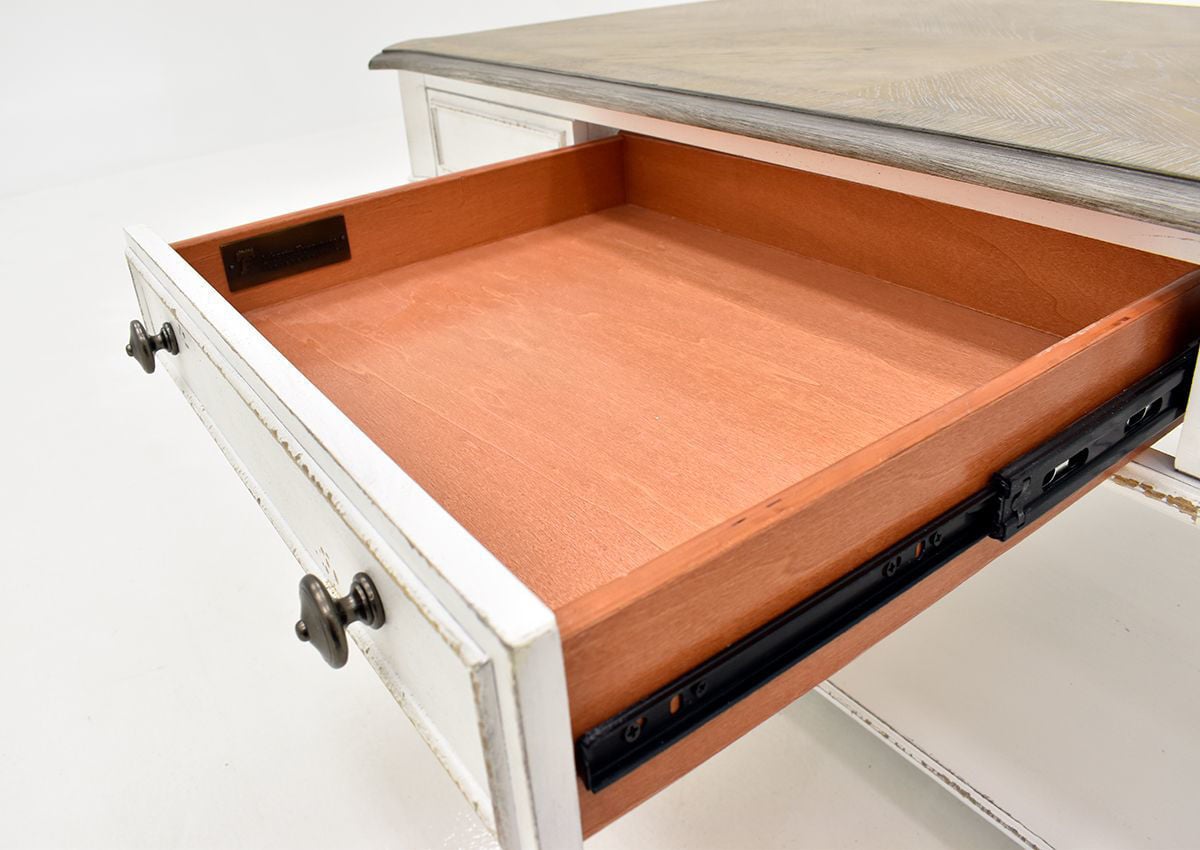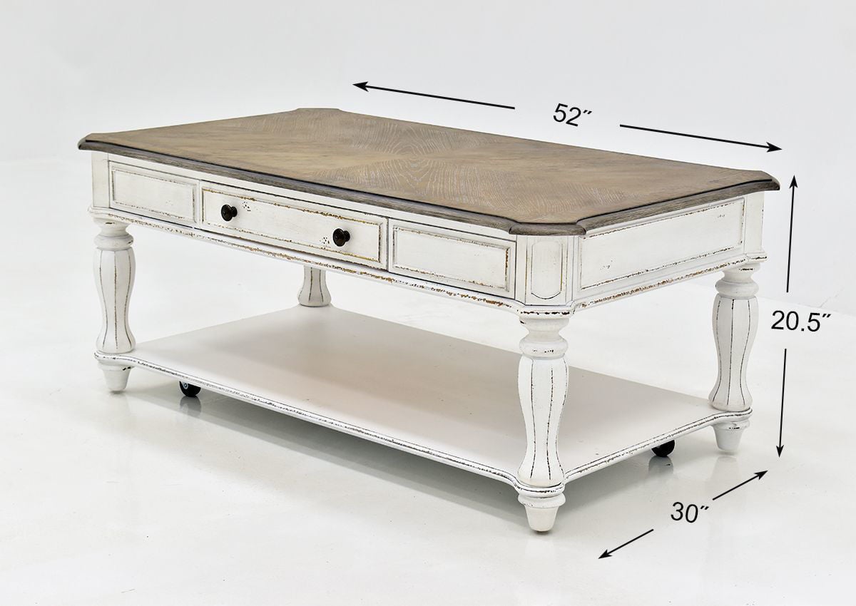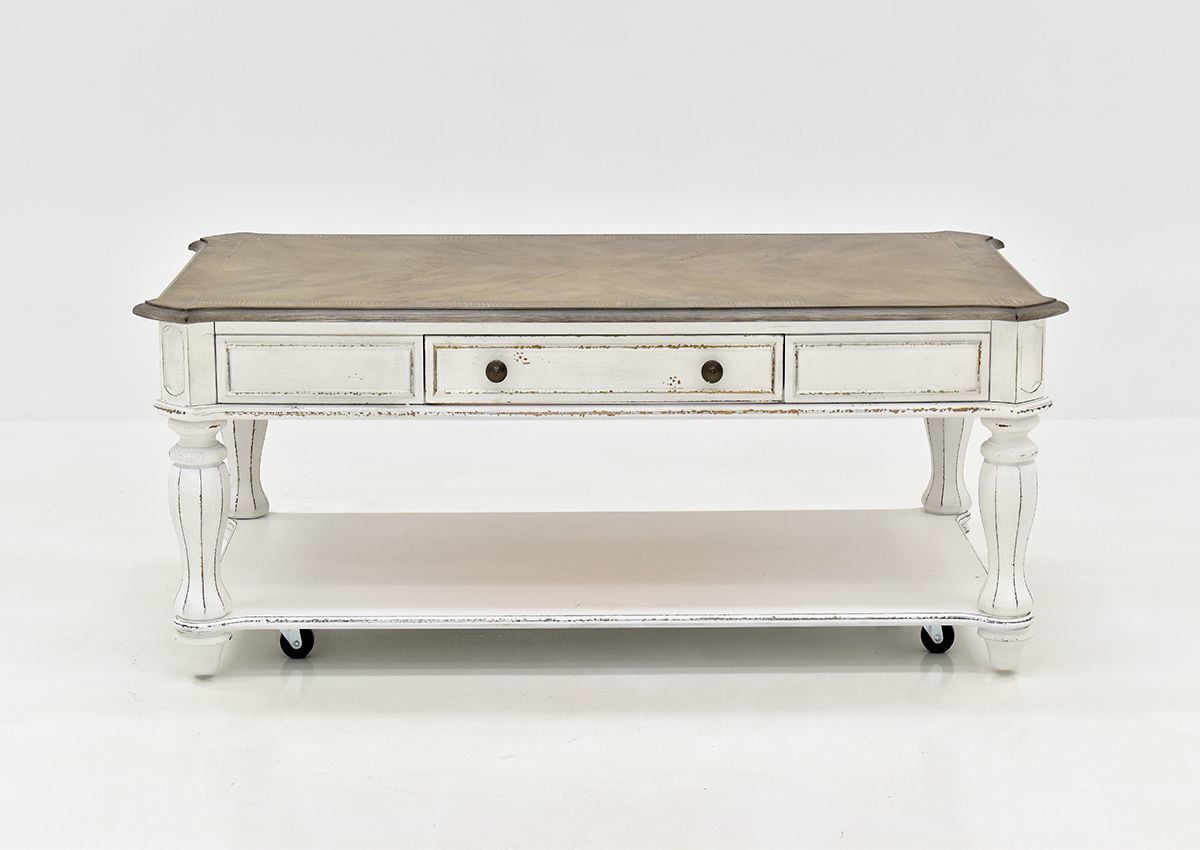 The rectangle Magnolia Manor Coffee Table by Liberty Furniture adds exquisite style to any traditional home or office. Featuring a spacious rectangle shaped table top, a fully finished dovetail drawer with metal side glides and a bottom shelf for extended storage, the table showcases elegant accents and tall turned legs. Completed with an antique white finish and bottom casters, this table will easily and instantly transform your living room setting.