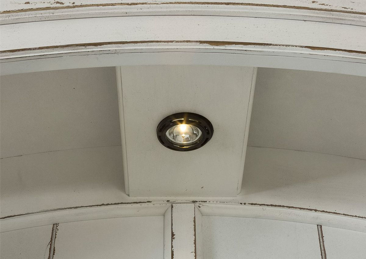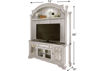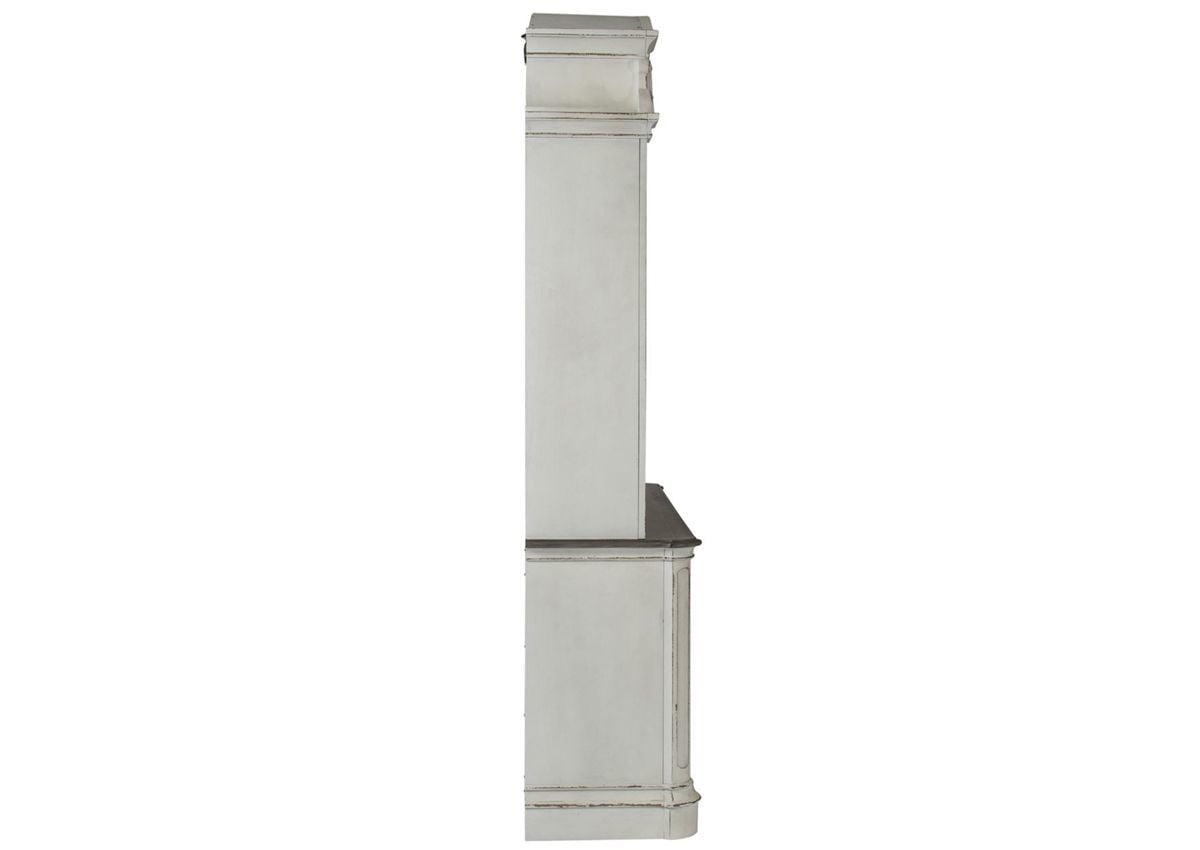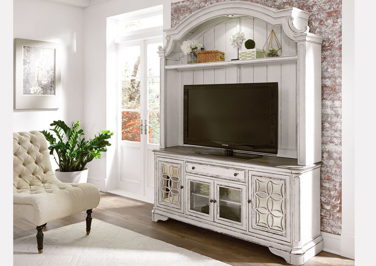 Create an inviting and beautiful look to your living space with the Magnolia Manor Collection. This French country inspired Entertainment Center combines traditional, rustic and vintage styles and is quality constructed for years of enjoyment. The Magnolia Manor 2 Piece Entertainment Center features beautifully distressed antique white finishes, whitewashed and weathered brown tops, antique pewter hardware, bead molding, and canted corners. This media storage cabinet and shelving unit are quality