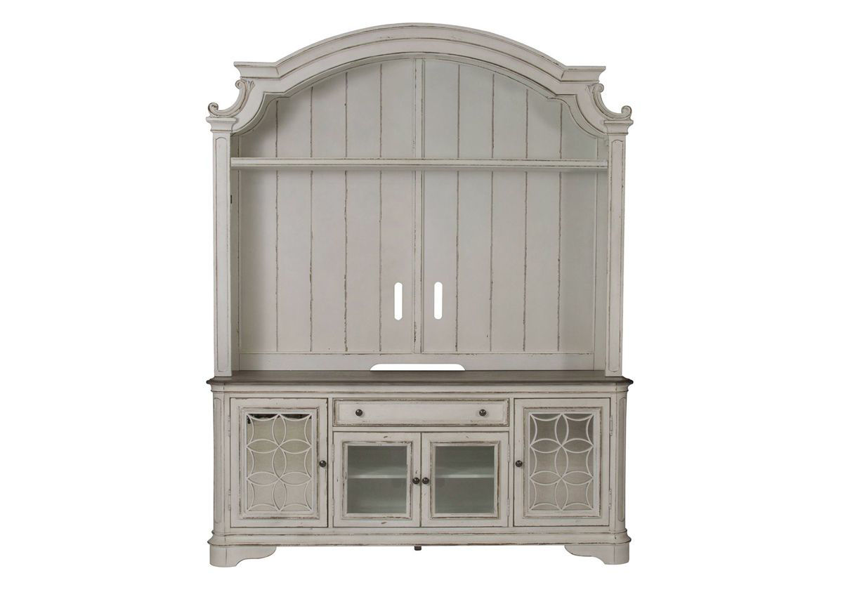 Magnolia Manor 2 Piece Entertainment Center by Liberty Furniture. Distressed White Finish. Open Shelf, Drawer and Multi Cabinet Storage.