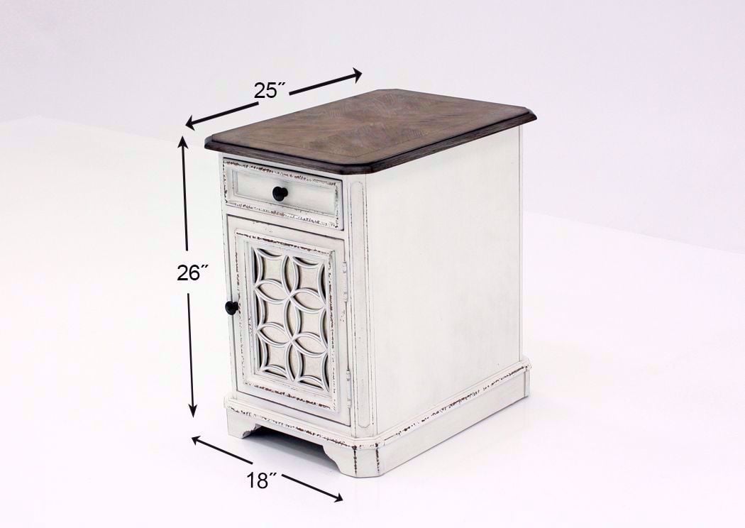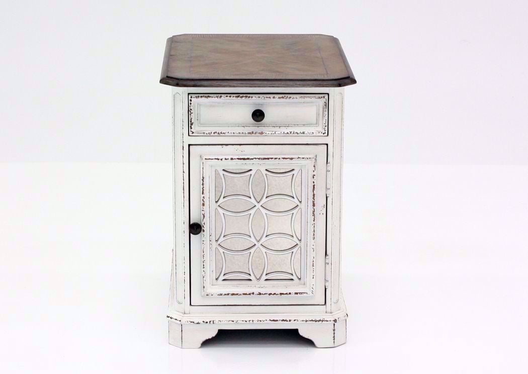 The unique and charmingly rustic Magnolia Manor Chairside End Table by Liberty Furniture makes a wonderful accent for any traditional living setting or office. Highlighted by a beautiful front door with decorative grid paneling, the piece also includes a fully stained dovetail drawer with full extension metal side glides. Completed with an antique white finish, this table seamlessly blends rustic and transitional style elements.