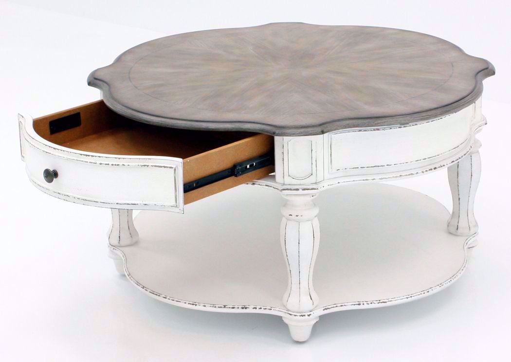 Magnolia Manor Round Coffee Table by Liberty. Rustic Antique White Finish. Traditional Style.