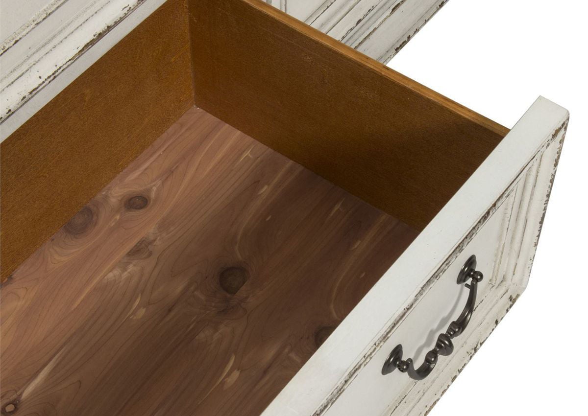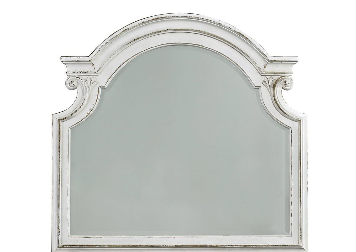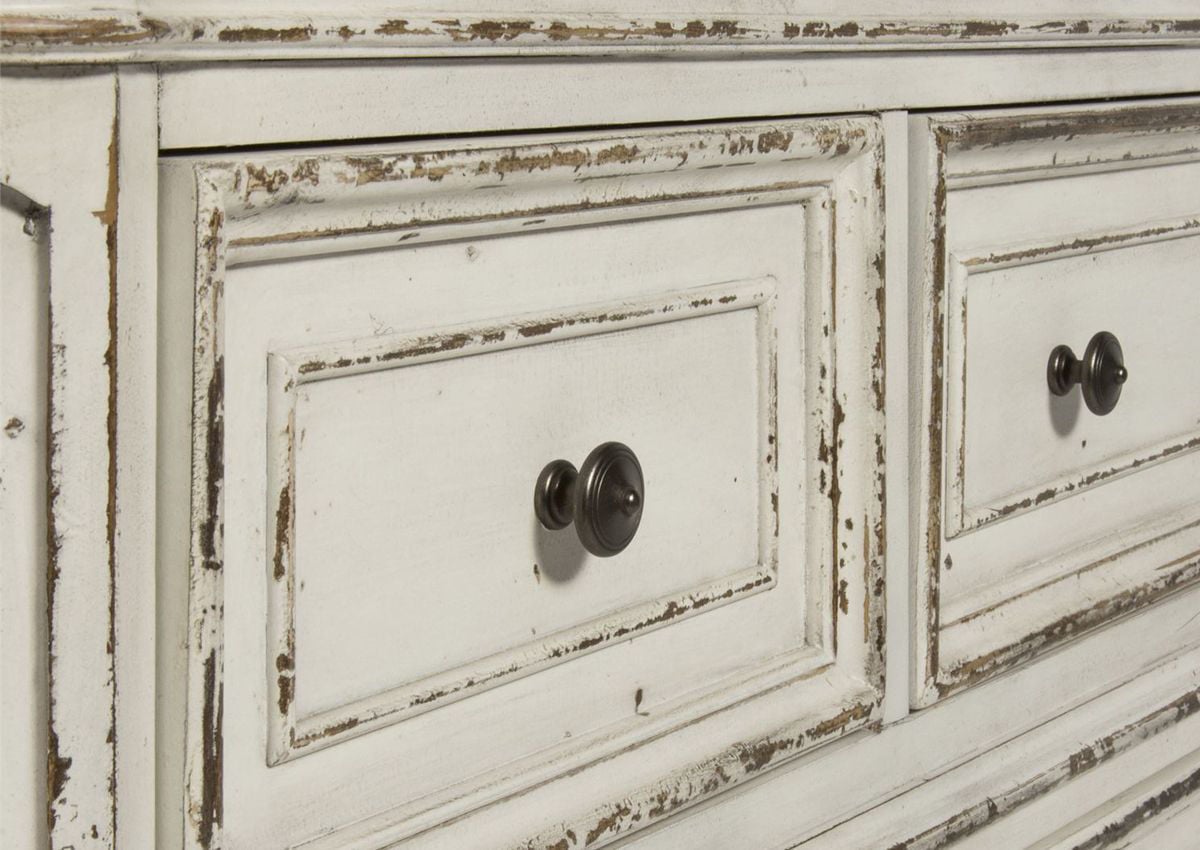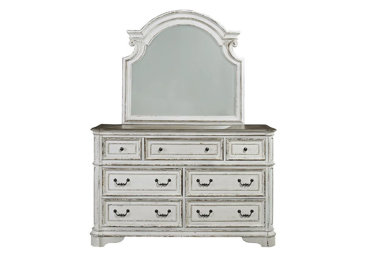 Create an inviting and beautiful look to your bedroom with the Magnolia Manor Bedroom Collection. This French country inspired Dresser with Mirror combines traditional, rustic and vintage styles to create an elegant piece. The quality constructed Magnolia Manor Collection features beautifully distressed antique white finishes, whitewashed and weathered brown tops, antique pewter hardware, bead molding, and canted corners. The Magnolia Manor Dresser with Mirror offers 7 spacious drawers for your convenience and a beautiful mirror with an arched design.