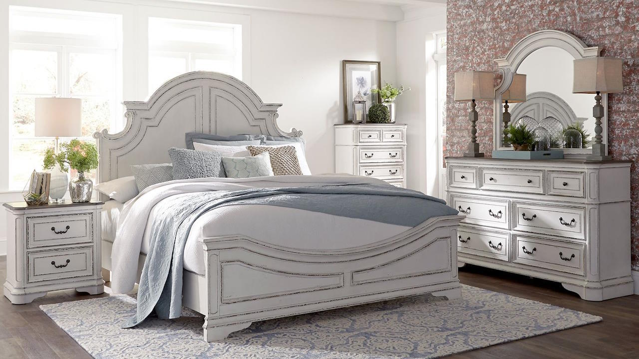 Magnolia Manor King Size Panel Bedroom Set by Liberty Furniture. Distressed White Finish. French Country Charm.