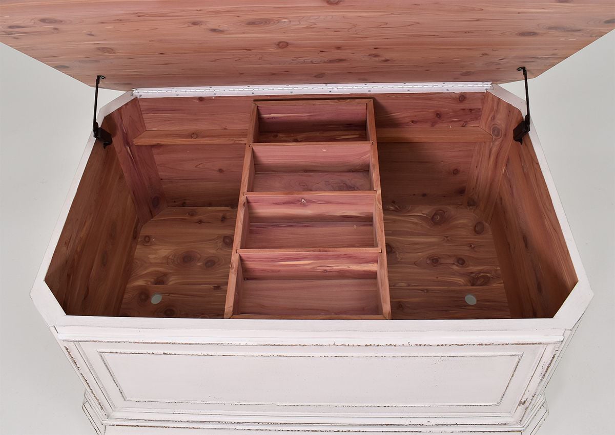 Yesterday, today and tomorrow - the Magnolia Manor Storage Trunk is the perfect storage solution that will complement most home, office or bedroom decors. Designed with a nod to the classic and traditional hope chest, the Magnolia Manor Trunk blends style and function with an beautiful antique white finish, weathered brown top and cedar interior lining. There is tons of storage space for your treasured memories, blankets or other items that need to be tucked away but close at hand. And you will love the customizable storage tray for smaller or fragile items. The Magnolia Manor Storage Trunk can be used bedroom storage, office storage or a coffee table with storage.