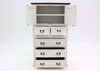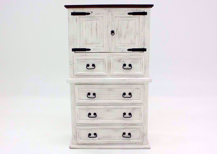 The Mansion Door Chest of Drawers by Vintage Furniture is constructed with a durable solid wood covered in a white distressed finish. Other features include heavy-duty wrought iron hardware and plenty of storage space in the five drawers as well as the cabinet at the top. Totally unique, The Mansion door chest of drawers is sure to delight you for years to come.