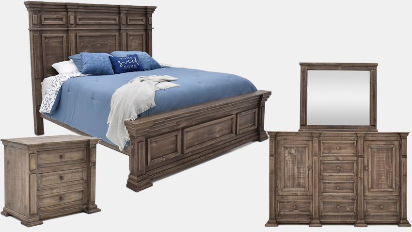 The Maverick Queen Size Bedroom Set will make a bold and beautiful addition to your bedroom. This rustic-styled bedroom collection has a beautiful weathered finish of gray with hints of brown. The solid wood constructed panel-style queen size bed has framed overlays and hefty molding accents on the headboard and footboard. The Maverick Queen Size Bedroom Set includes a queen size bed, dresser with mirror, and one nightstand.