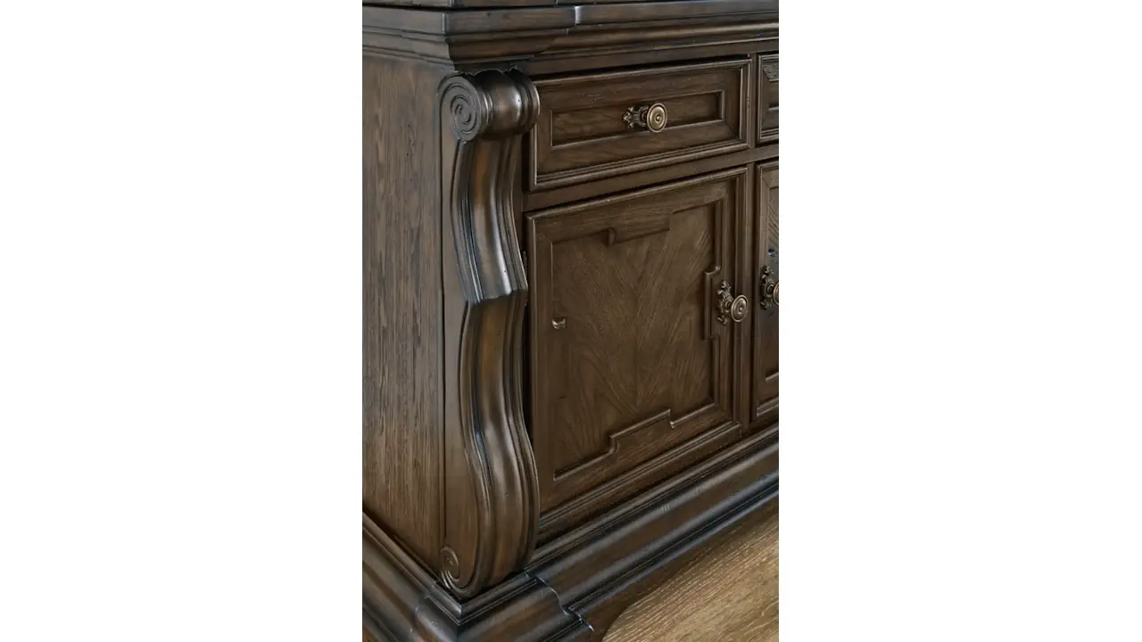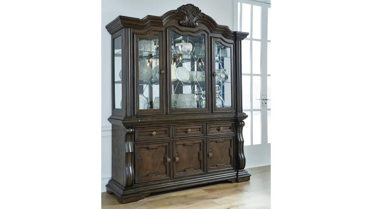Introducing the Maylee Dining Buffet and Hutch—a bold testament to exquisite design and functionality for your home. From intricate ornamental details to its grand size, this piece exudes unparalleled elegance. Adorned with decorative pilasters, beveled glass windows, and abundant storage, it captivates with its opulent style while retaining a timeless allure. Its presence? A seamless fit in any home setting.