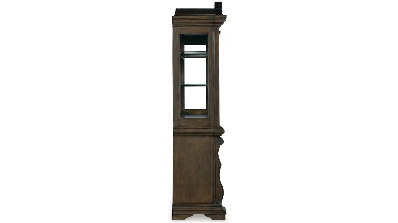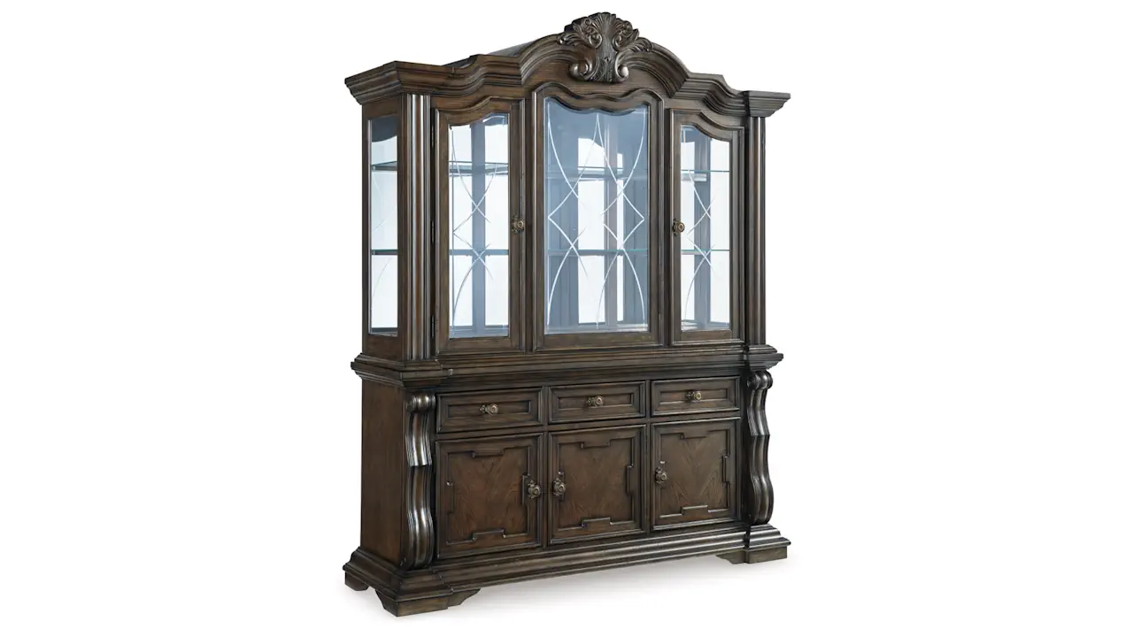 This set features both the dining buffet and hutch, meticulously crafted using hardwood solids, oak, and ash swirl veneers, along with MDF substrates and cast resin components, ensuring durability and sophistication. Finished in a rich dark brown, the hutch boasts beveled glass windows, a mirrored glass interior, two clear glass shelves, and LED display lighting. Meanwhile, the buffet cabinets offer a single adjustable shelf each, along with exquisitely finished drawers lined with felt—an embodiment of practical luxury.